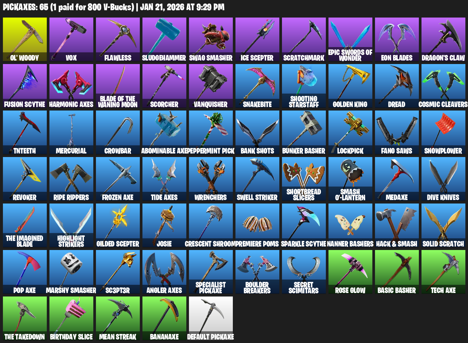 Ol’ Woody, Vox, Flawless, Sludgehammer, Swag Smasher, Scratchmark, Eon Blades, Dragon’s Claw, Harmonic Axes, Scorcher, Vanquisher, Snakebite, Shooting Starstaff, Dread, Cosmic Cleavers