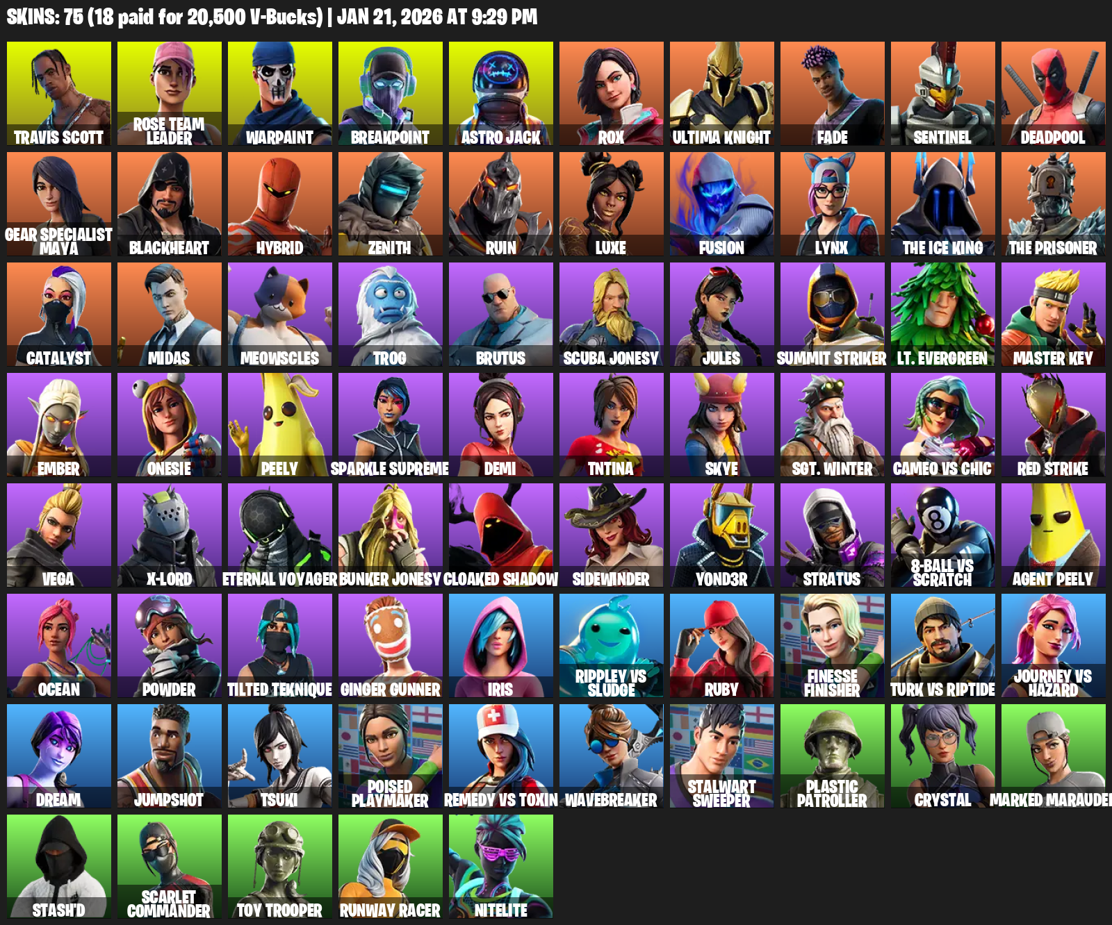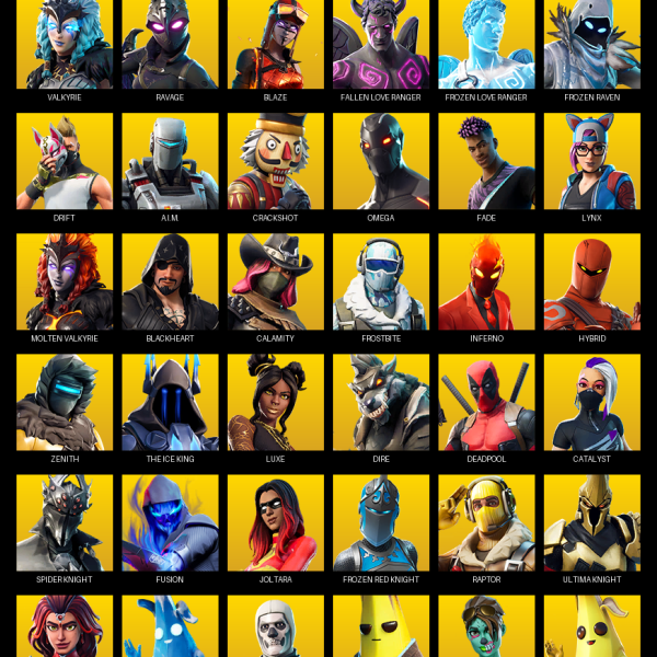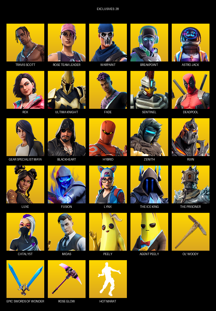 Travis Scott, Gear Specialist Maya, Rose Team Leader, Warpaint, Breakpoint, Astro Jack, Rox, Ultima Knight, Fade, Sentinel, Deadpool, Blackheart, Hybrid, Zenith, Ruin, Luxe, Fusion, Lynx, The Ice King