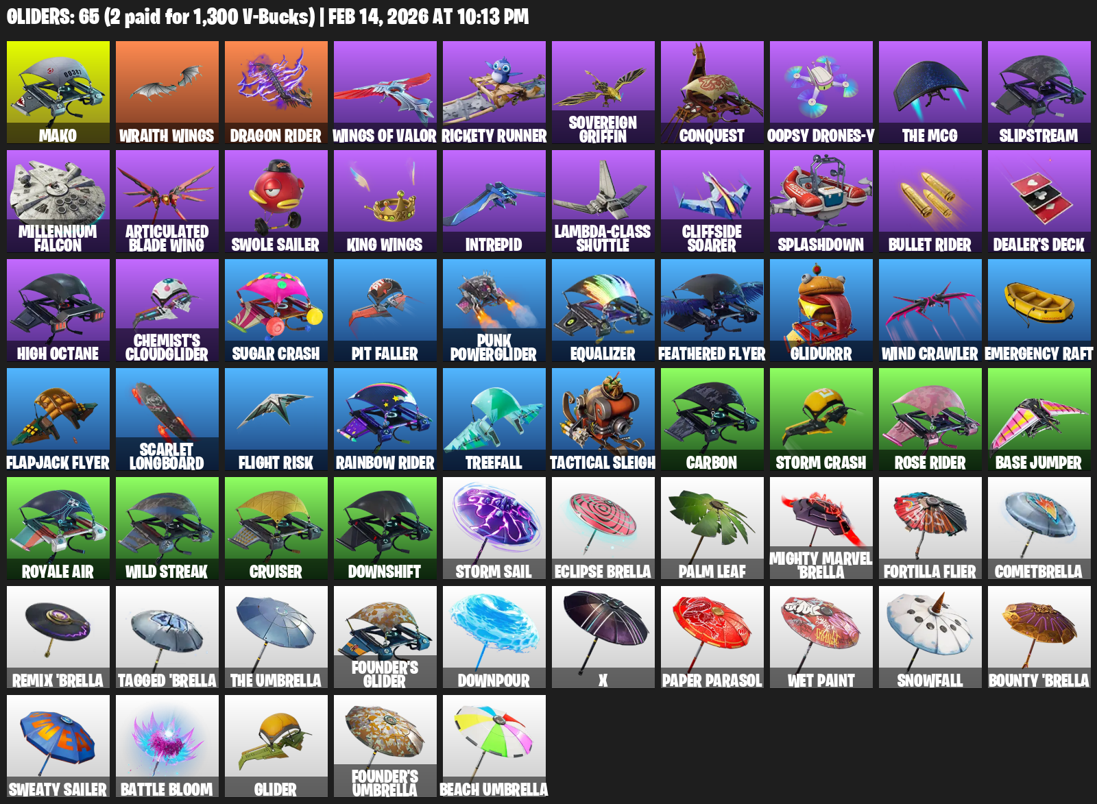 Mako, Wraith Wings, Rickety Runner, Sovereign Griffin, Conquest, Oopsy Drones-y, Slipstream, Millennium Falcon, Articulated Blade Wing, Swole Sailer, Intrepid, Lambda-Class Shuttle, Cliffside Soarer, Splashdown, Bullet Rider, Dealer’s Deck