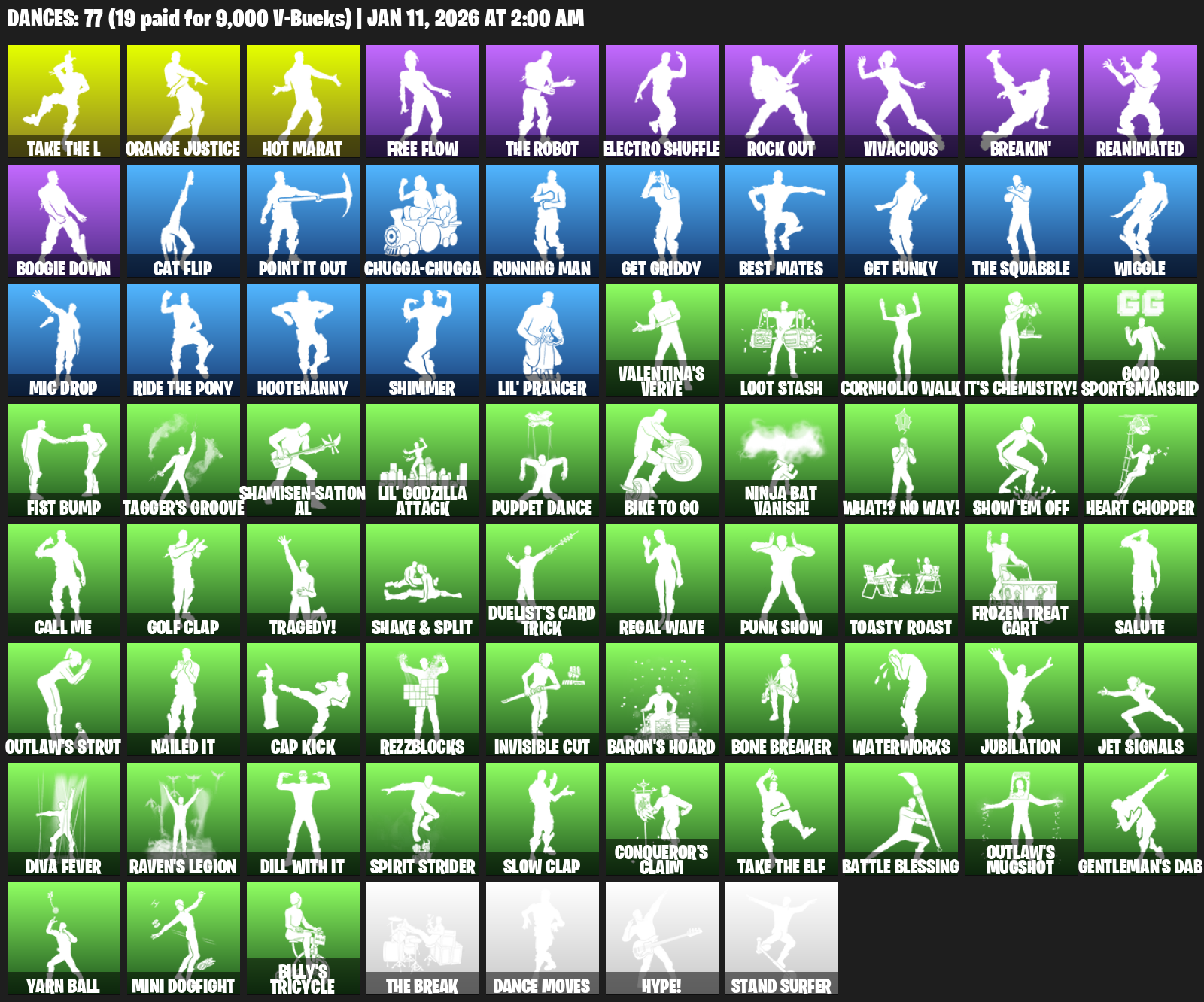 Hot Marat, Orange Justice, Free Flow, Electro Shuffle, Rock Out, Vivacious, Breakin’, Reanimated, Boogie Down, Cat Flip, Chugga-Chugga, Running Man, Get Griddy, Best Mates, Wiggle
