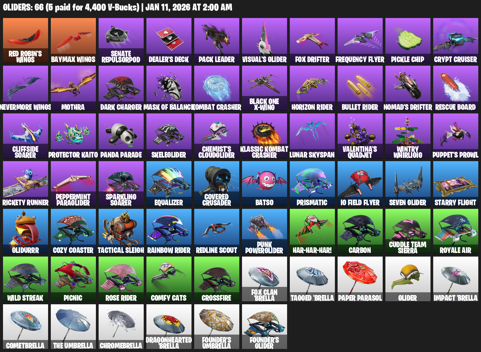 Red Robin’s Wings, Senate Repulsorpod, Dealer’s Deck, Visual’s Glider, Fox Drifter, Frequency Flyer, Pickle Chip, Crypt Cruiser, Mothra, Mask of Balance, Kombat Crasher, Black One X-wing, Horizon Rider, Rescue Board