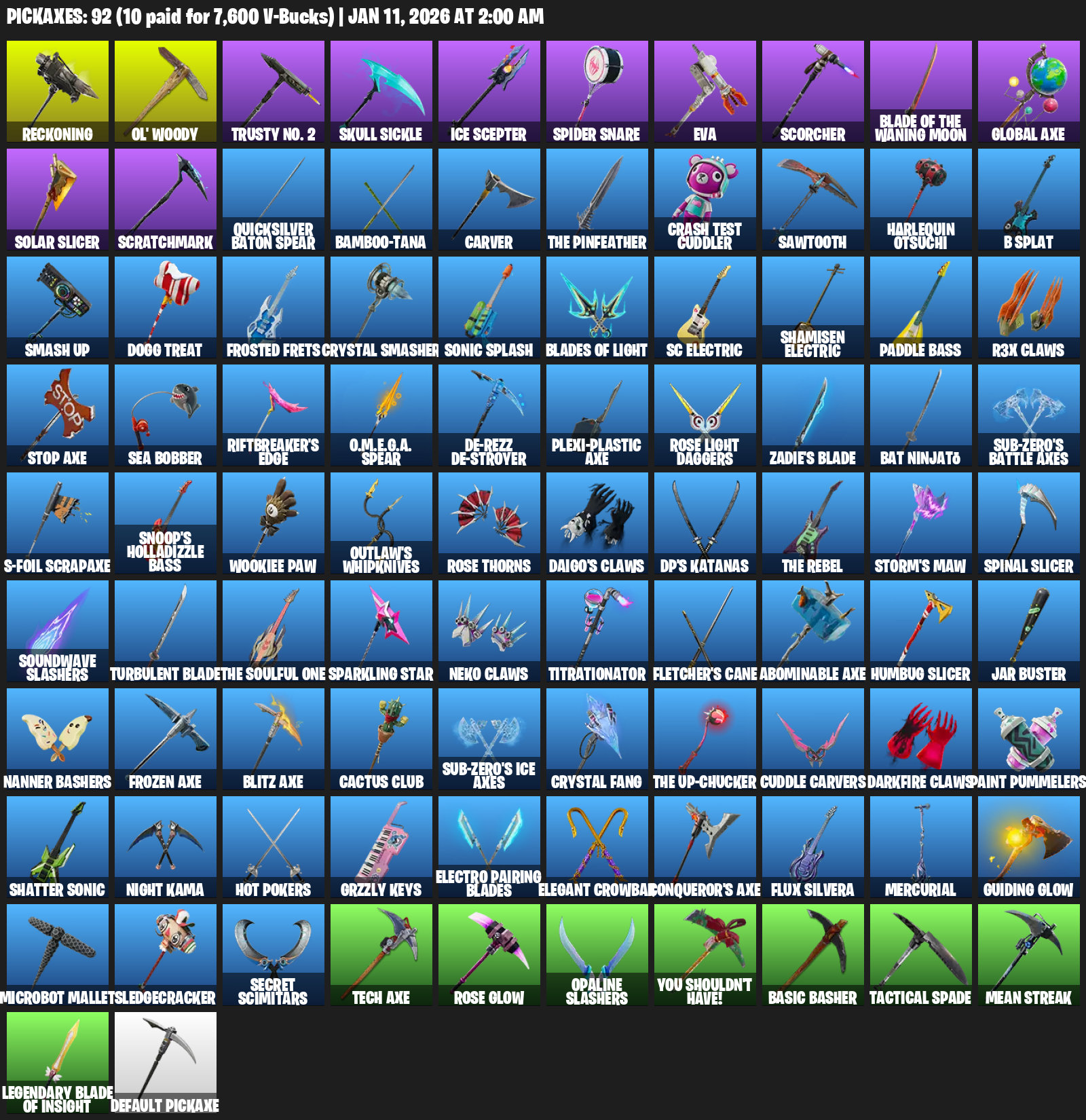 Reckoning, Ol’ Woody, Trusty No. 2, Skull Sickle, Ice Scepter, Spider Snare, EVA, Scorcher, Global Axe, Solar Slicer, Scratchmark, Quicksilver Baton Spear, Bamboo-tana, Carver, Crash Test Cuddler, Sawtooth, Harlequin Ōtsuchi, B Splat