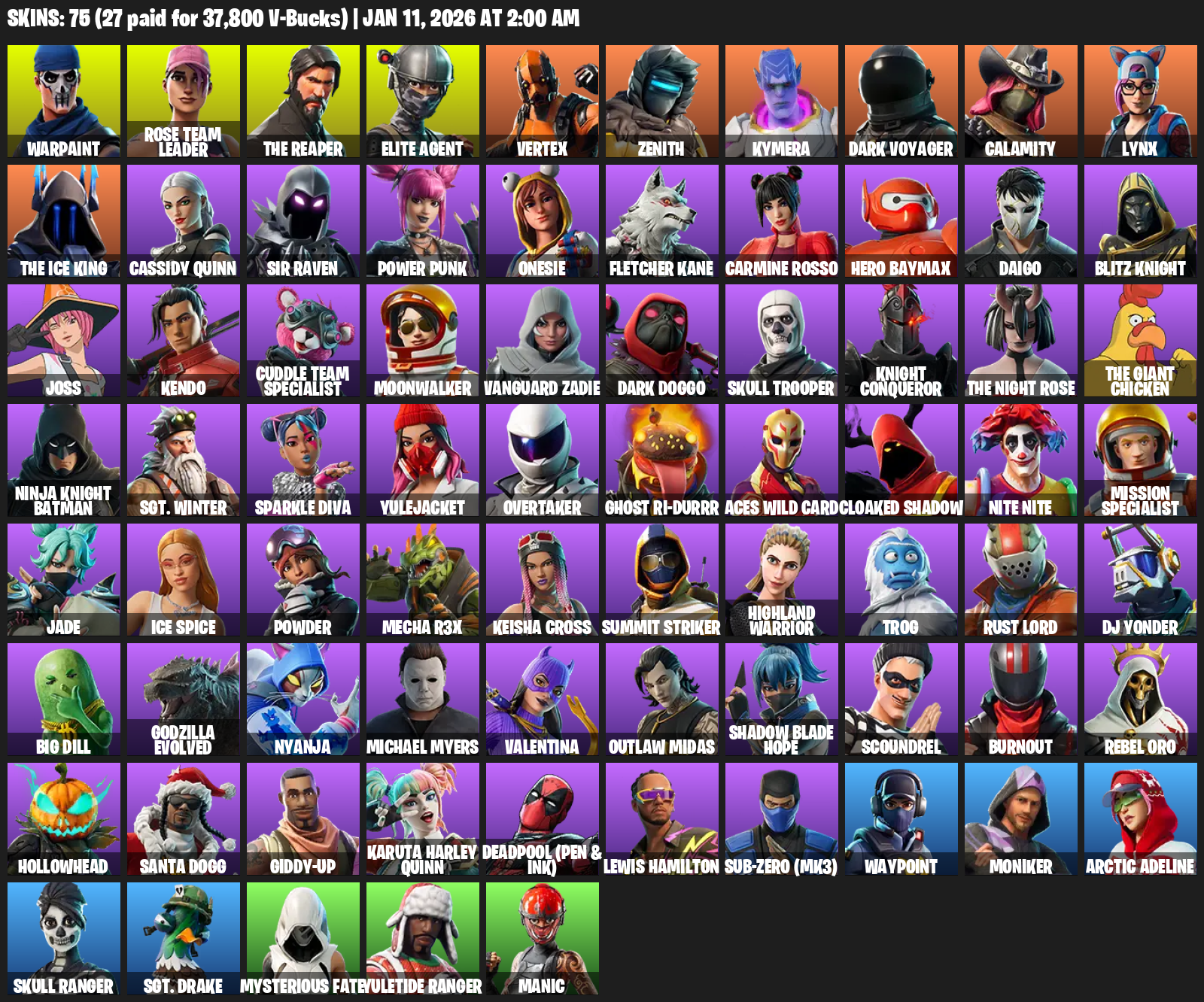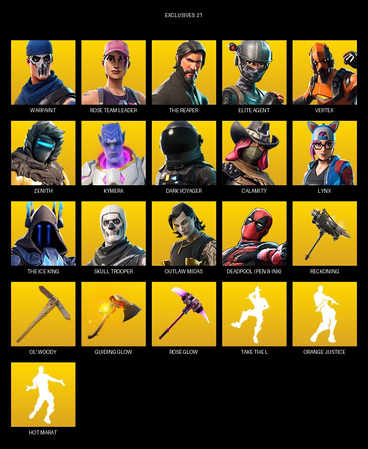 The Reaper, Elite Agent, Warpaint, Rose Team Leader, Vertex, Zenith, Kymera, Dark Voyager, Calamity, Lynx, Cassidy Quinn, Sir Raven, Power Punk, Onesie, Fletcher Kane, Carmine Rosso, Hero Baymax, Daigo, Blitz Knight