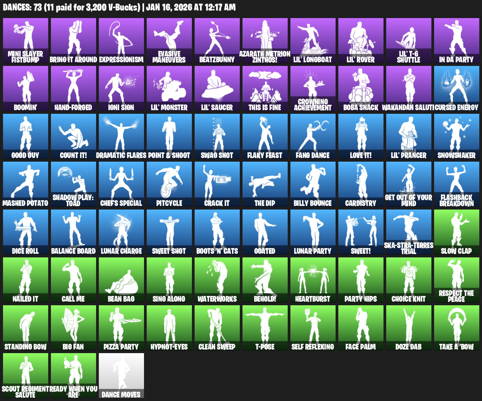 Mini Slayer Fistbump, Bring it around, Expressionism, Evasive Maneuvers, BeatzBunny, Azarath Metrion Zinthos!, Lil’ Longboat, In Da Party, Boomin’, Hand-Forged, Igni Sign, This is Fine, Crowning Achievement, Boba Snack, Wakandan Salute, Cursed Energy