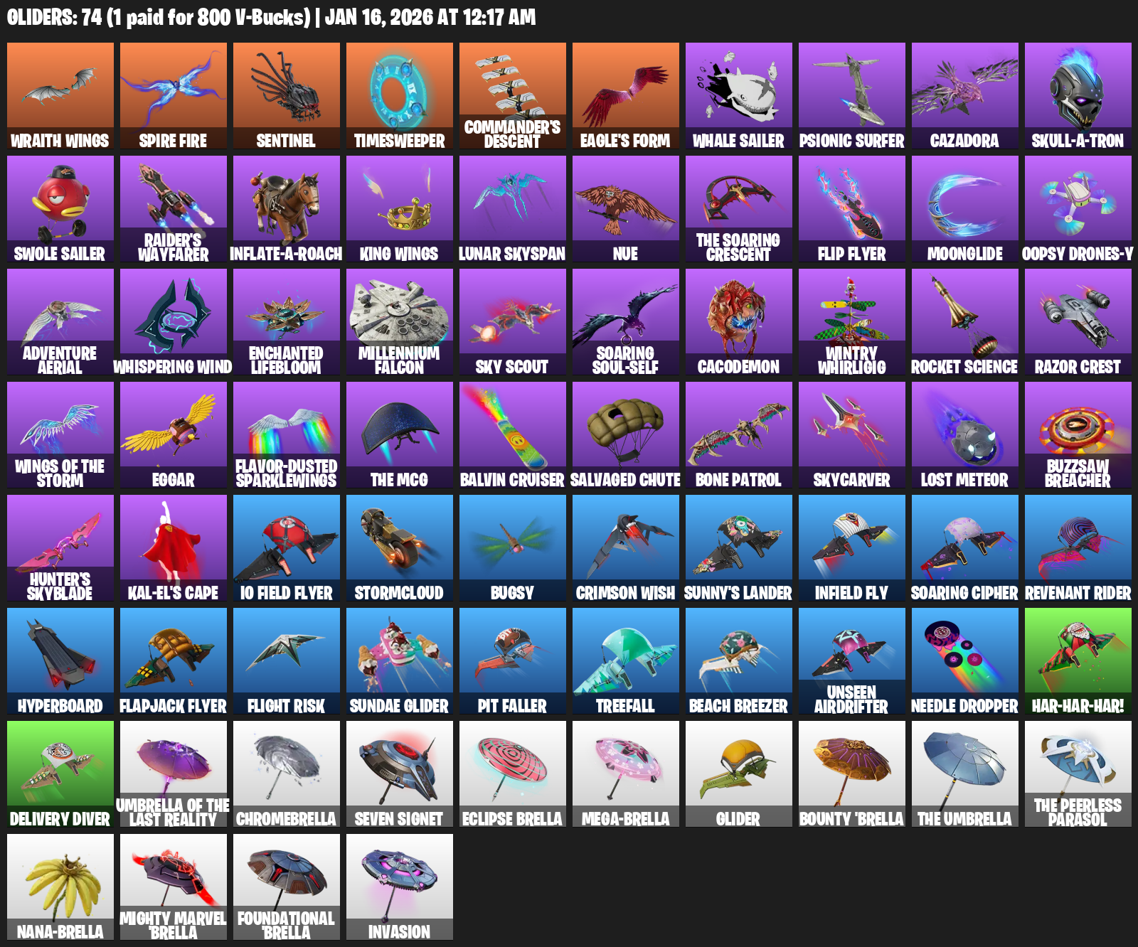 Wraith Wings, Spire Fire, Sentinel, Timesweeper, Commander’s Descent, Eagle’s Form, Whale Sailer, Psionic Surfer, Cazadora, Skull-a-tron, Raider’s Wayfarer, Lunar Skyspan, Nue, Flip Flyer, Moonglide, Oopsy Drones-y