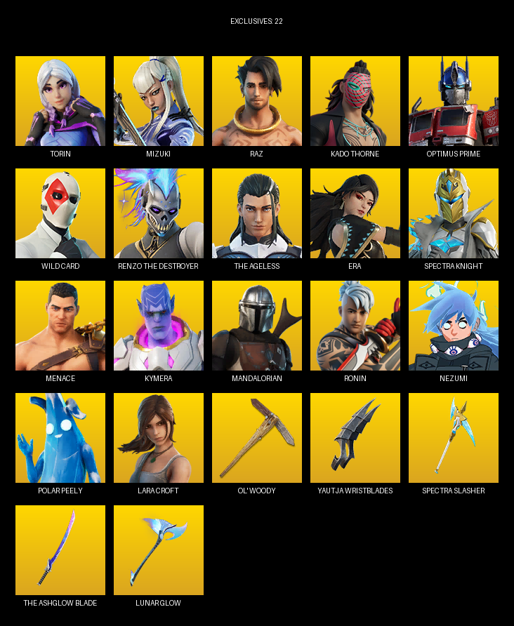 Lara Croft, Torin, Mizuki, Raz, Kado Thorne, Optimus Prime, Wild Card, Renzo the Destroyer, Era, Spectra Knight, Menace, Kymera, Mandalorian, Ronin, Nezumi, Fabio Sparklemane, Cluck, Helsie, Massai