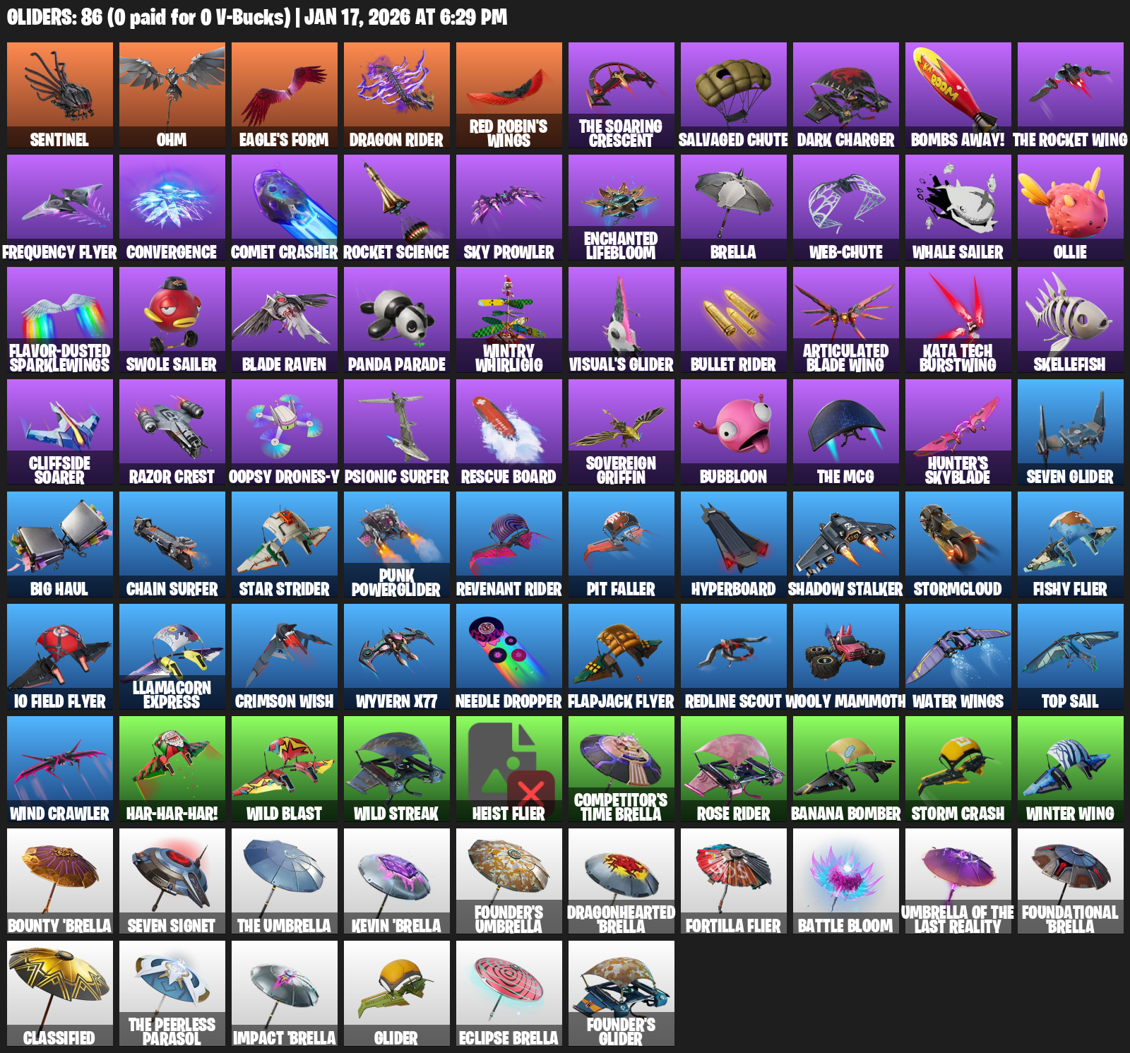 Sentinel, Ohm, Eagle’s Form, Red Robin’s Wings, Salvaged Chute, Dark Charger, Bombs Away!, Frequency Flyer, Convergence, Comet Crasher, Rocket Science, Sky Prowler, Enchanted Lifebloom, Brella, Whale Sailer, Ollie