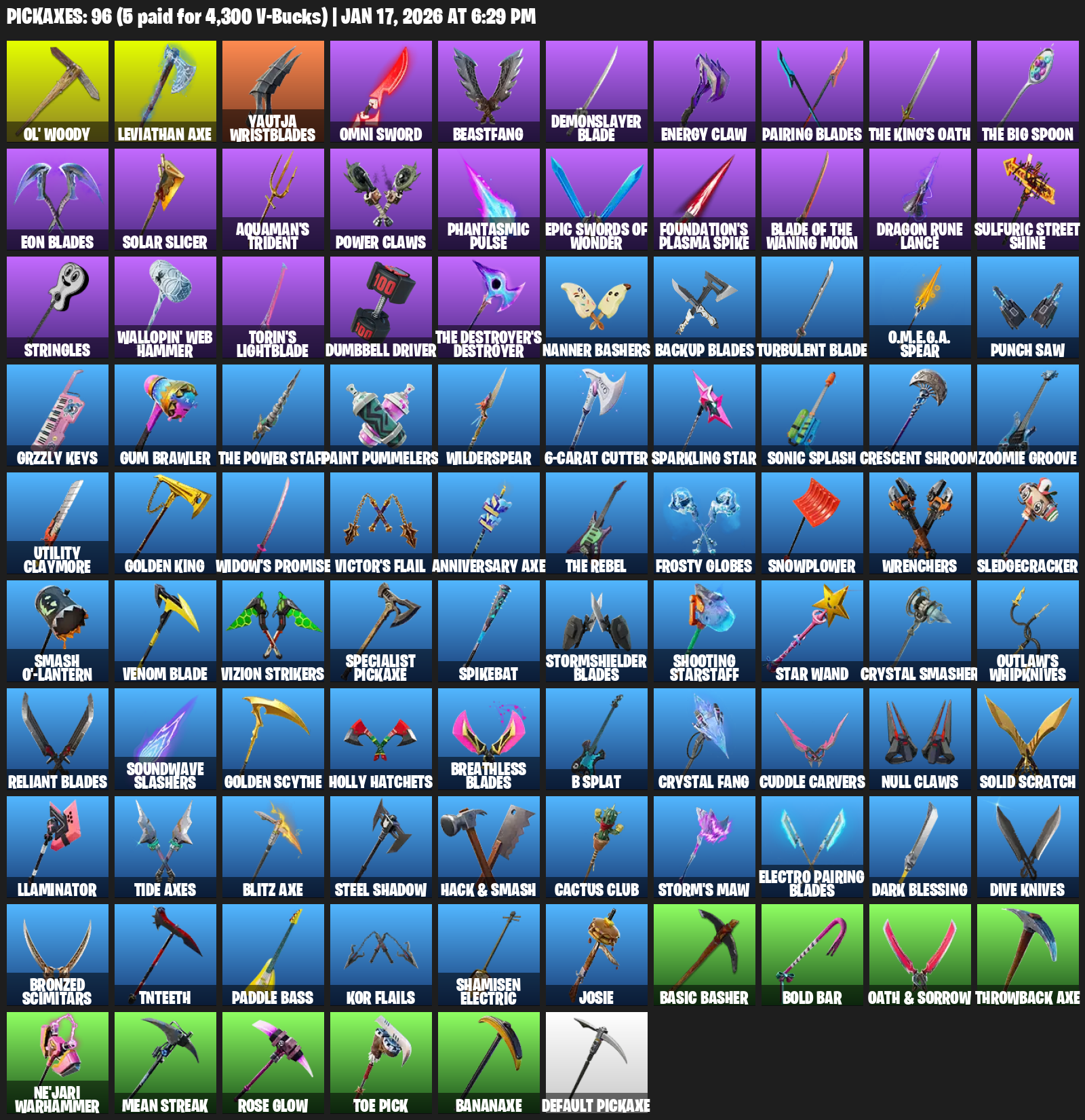 Leviathan Axe, Ol’ Woody, Yautja Wristblades, Omni Sword, Beastfang, Demonslayer Blade, Energy Claw, Pairing Blades, Solar Slicer, Aquaman’s Trident, Power Claws, Phantasmic Pulse, Foundation’s Plasma Spike, Dragon Rune Lance, Sulfuric Street Shine