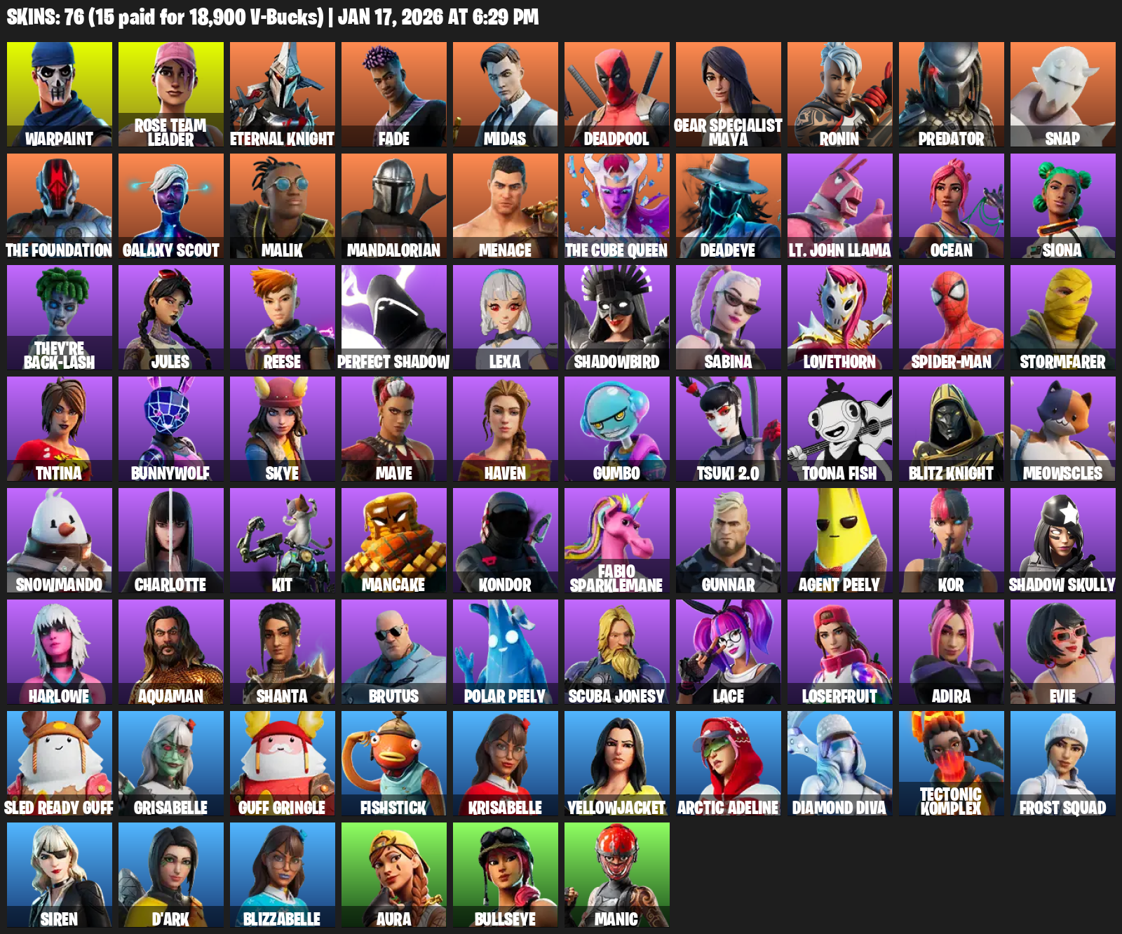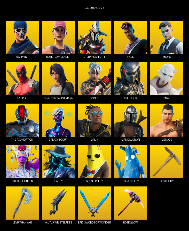 Gear Specialist Maya, Warpaint, Rose Team Leader, Eternal Knight, Fade, Midas, Deadpool, Ronin, Predator, Snap, The Foundation, Galaxy Scout, Malik, Mandalorian, Menace, Deadeye, Lt. John Llama, Ocean, Siona