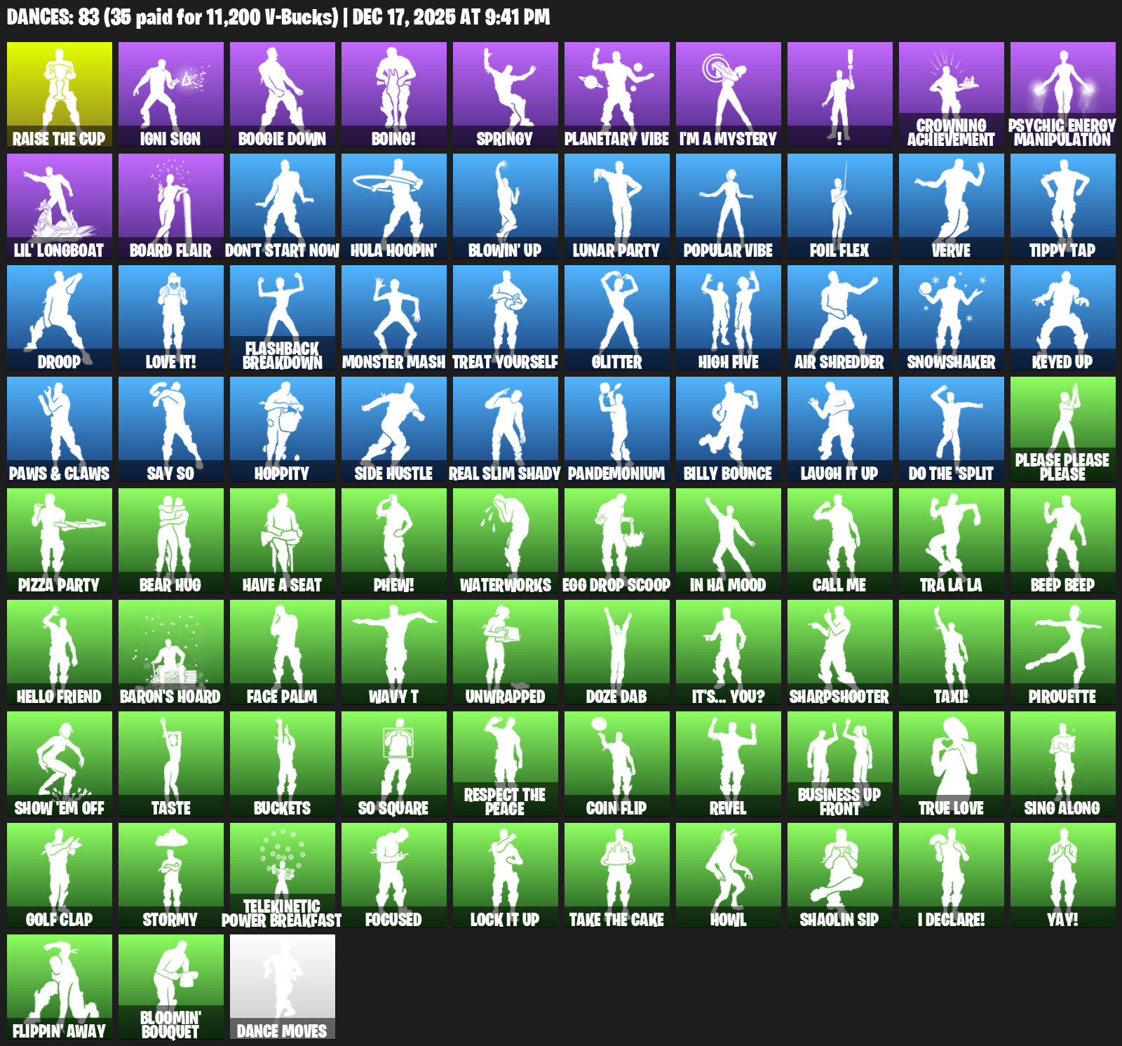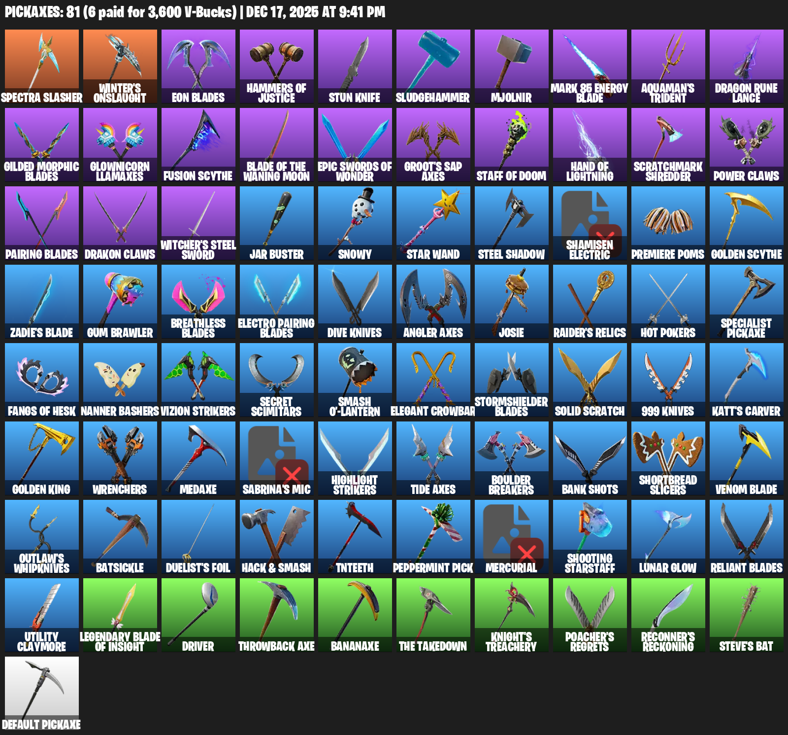 Spectra Slasher, Winter’s Onslaught, Eon Blades, Hammers of Justice, Stun Knife, Sludgehammer, Mjolnir, Mark 85 Energy Blade, Aquaman’s Trident, Dragon Rune Lance, Glownicorn Llamaxes, Groot’s Sap Axes, Scratchmark Shredder, Power Claws