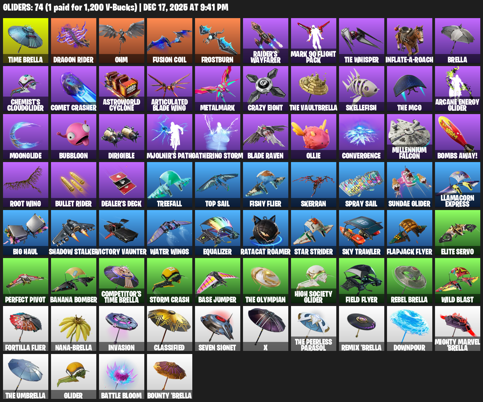 Time Brella, Ohm, Frostburn, Raider’s Wayfarer, TIE Whisper, Chemist’s Cloudglider, Comet Crasher, Astroworld Cyclone, Metalmark, Crazy Eight, Skellefish