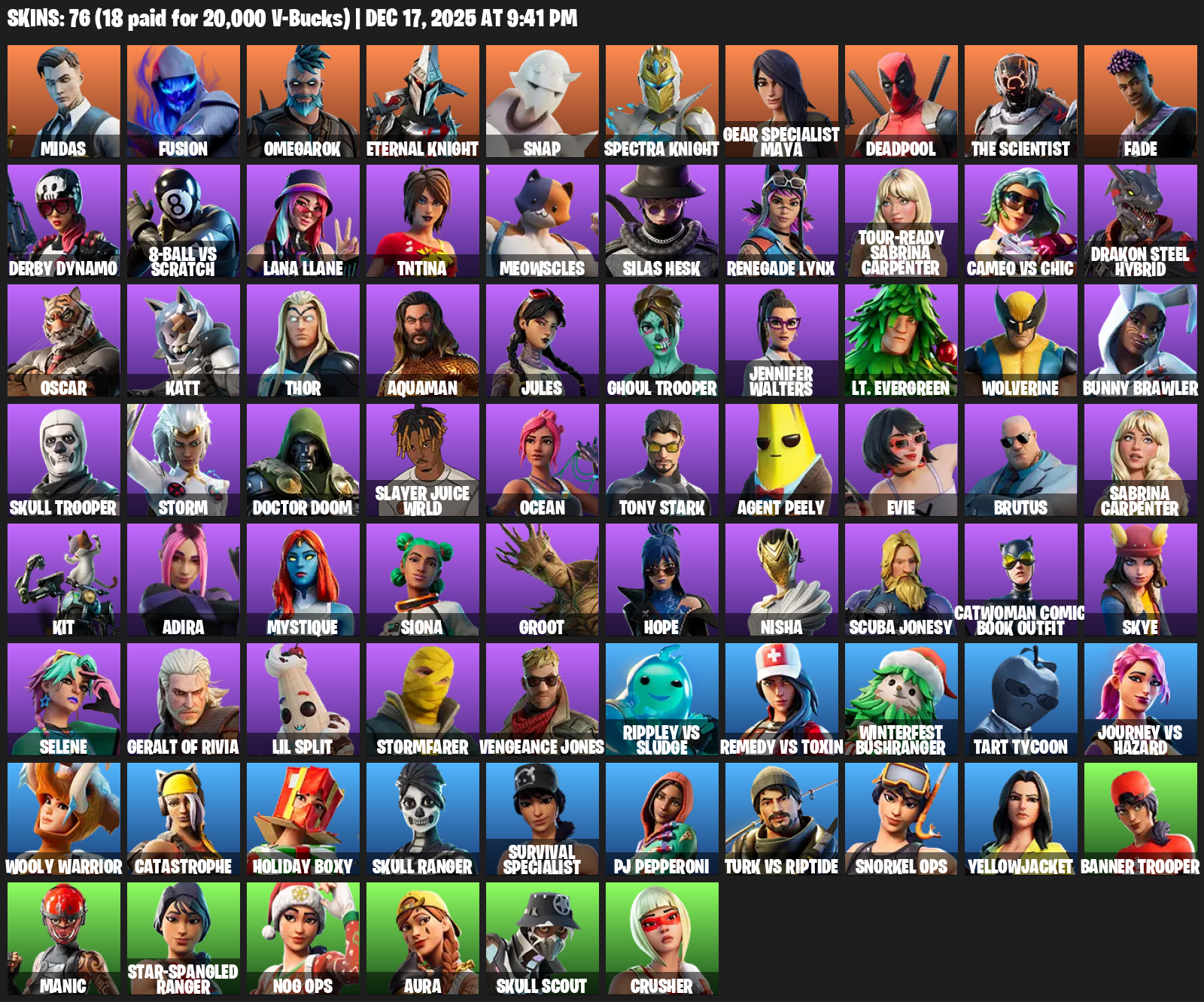 Gear Specialist Maya, Midas, Fusion, Omegarok, Eternal Knight, Snap, Deadpool, The Scientist, Fade, Derby Dynamo, 8-Ball vs Scratch, Lana Llane, TNTina, Meowscles, Silas Hesk, Renegade Lynx, Tour-Ready Sabrina Carpenter, Drakon Steel Hybrid