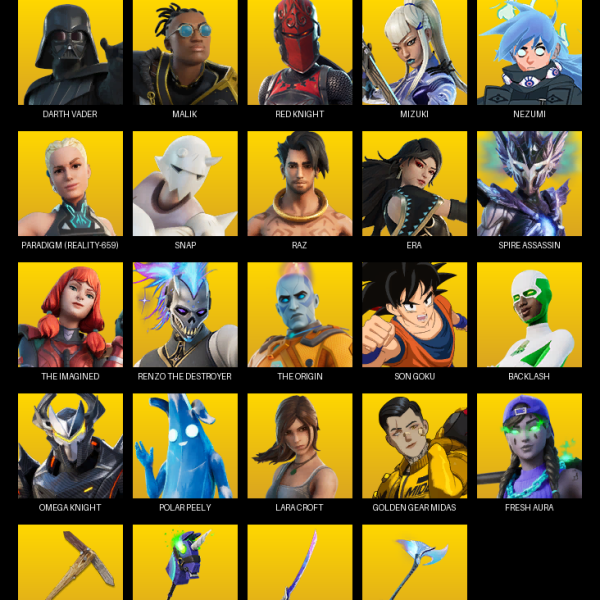 Controller, Reckoning, Winter’s Onslaught, Harmonic Axes, Scratchmark Shredder, Vox, Scorcher, Dragon’s Claw, Dumbbell Driver, Rift Edge, Mech Axe, Permafrost, Swag Smasher, Flawless