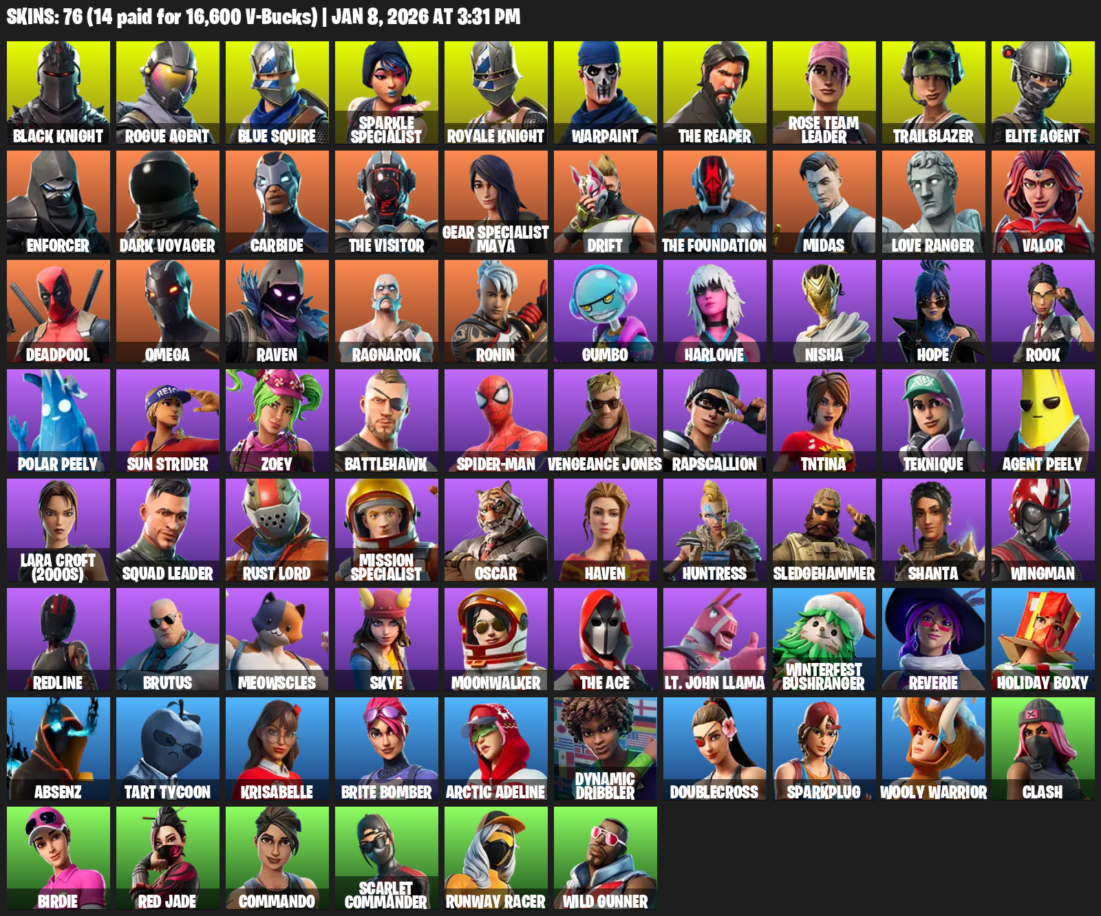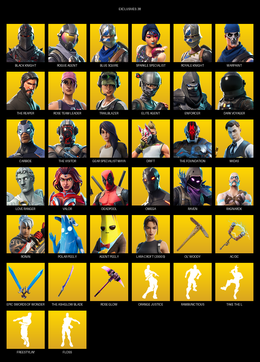 Black Knight, Blue Squire, Sparkle Specialist, The Reaper, Elite Agent, Omega, Warpaint, Rose Team Leader, Trailblazer, Enforcer, Dark Voyager, Carbide, Drift, Midas, Love Ranger