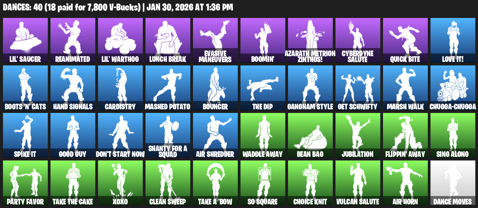 Lil’ Saucer, Reanimated, Lunch Break, Evasive Maneuvers, Boomin’, Azarath Metrion Zinthos!, Cyberdyne Salute, Quick Bite, Love it!, Boots ‘n’ Cats, Hand Signals, Cardistry, Mashed Potato, Bouncer, Gangnam Style, Get Schwifty, Marsh Walk, Chugga-Chugga