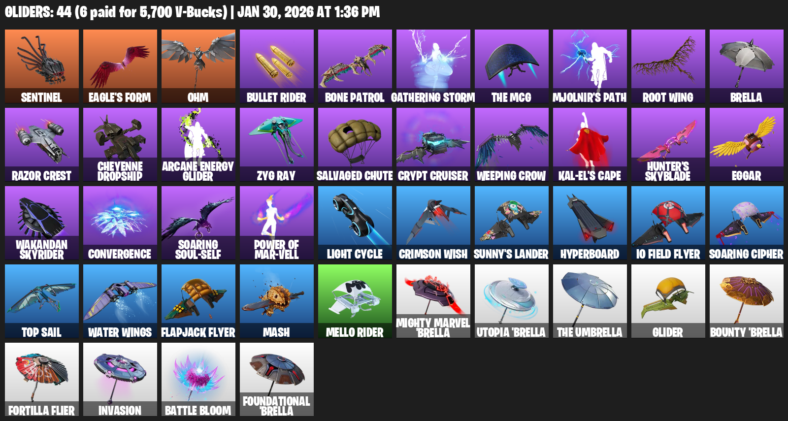 Sentinel, Eagle’s Form, Ohm, Bullet Rider, Bone Patrol, Gathering Storm, Mjolnir’s Path, Root Wing, Brella, Razor Crest, Cheyenne Dropship, Arcane Energy Glider, Zyg Ray, Salvaged Chute, Crypt Cruiser, Weeping Crow, Kal-El’s Cape, Hunter’s Skyblade, Eggar