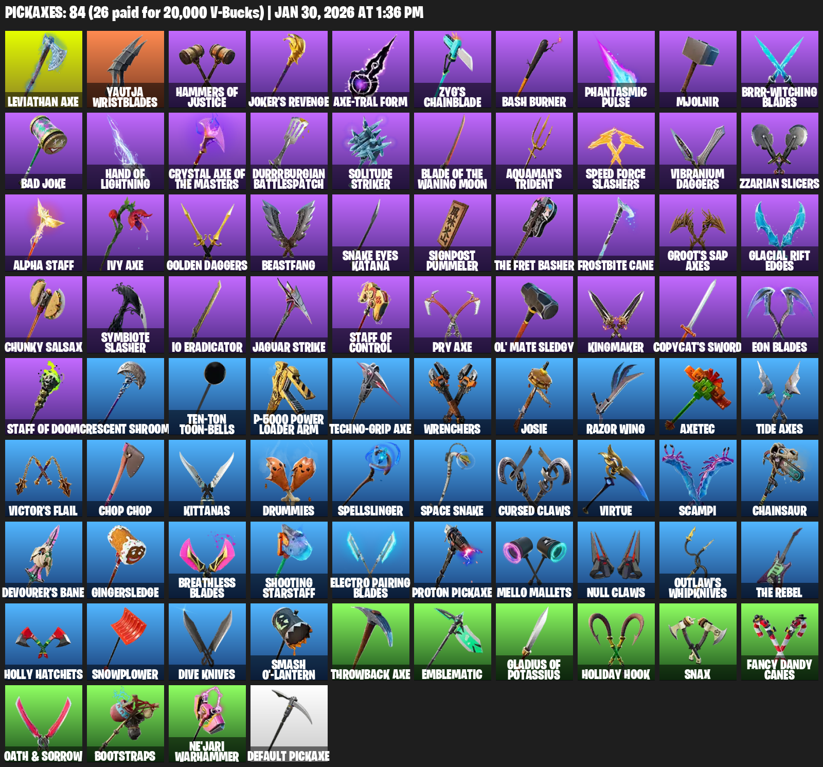Leviathan Axe, Yautja Wristblades, Hammers of Justice, Joker’s Revenge, Zyg’s Chainblade, Bash Burner, Phantasmic Pulse, Mjolnir, Brrr-witching Blades, Bad Joke, Durrrburgian Battlespatch, Solitude Striker, Aquaman’s Trident, Speed Force Slashers, Vibranium Daggers, Zzarian Slicers