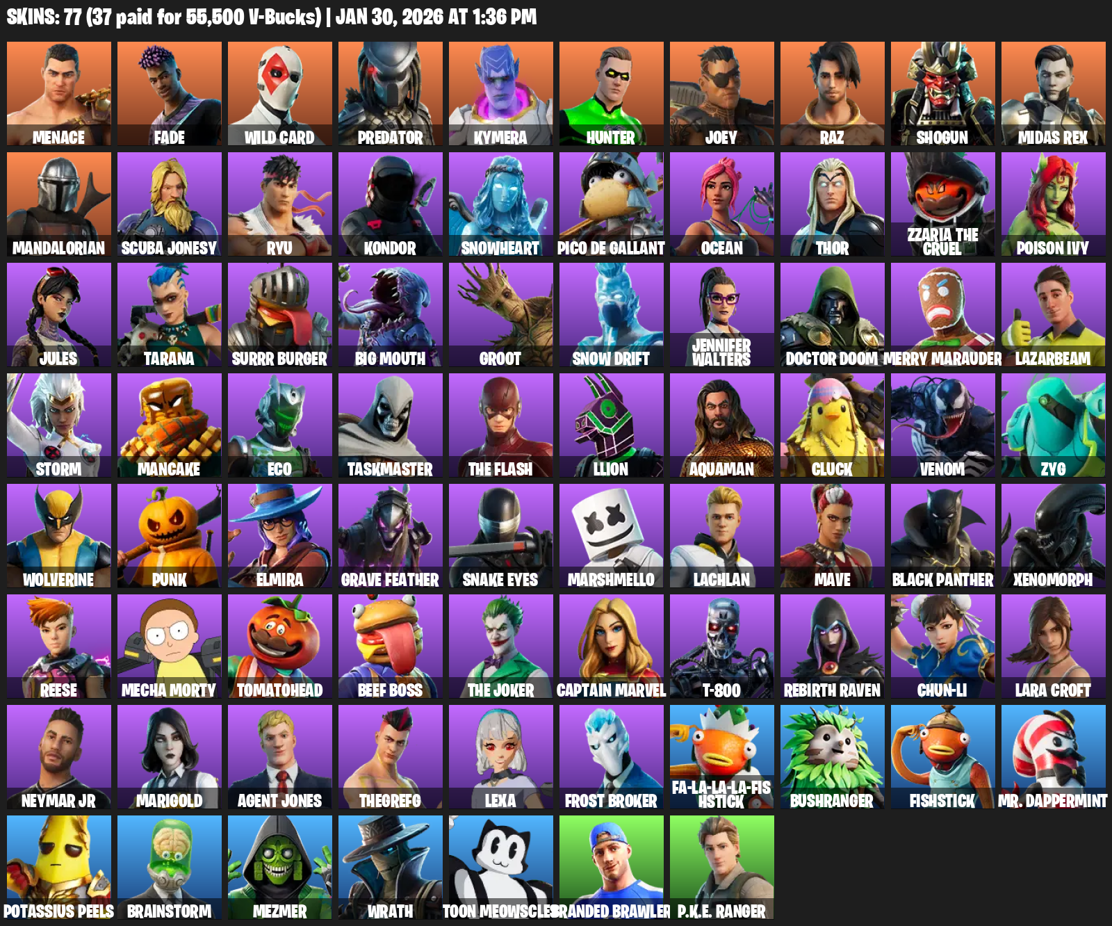 Lara Croft, Menace, Fade, Wild Card, Predator, Kymera, Hunter, Joey, Raz, Shogun, Midas Rex, Mandalorian, Scuba Jonesy, Ryu, Kondor, Snowheart, Pico de Gallant, Ocean, Thor, Zzaria The Cruel