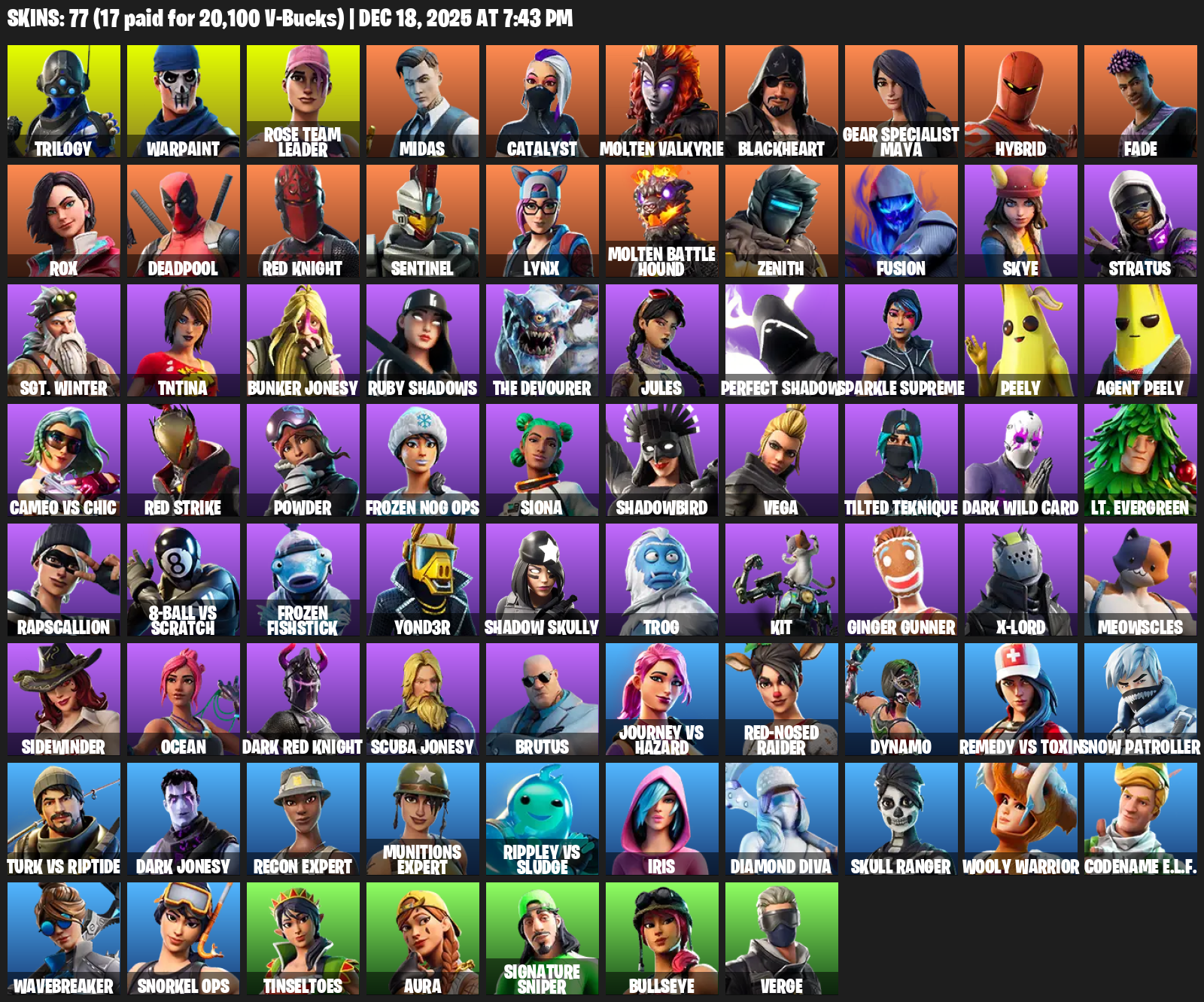 Gear Specialist Maya, Trilogy, Warpaint, Rose Team Leader, Midas, Catalyst, Molten Valkyrie, Blackheart, Hybrid, Fade, Rox, Deadpool, Red Knight, Sentinel, Lynx, Zenith, Fusion, Skye, Stratus