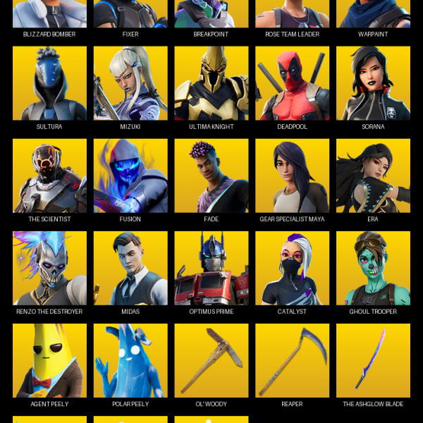 Travis Scott, Gear Specialist Maya, Lara Croft, Eon, The Imagined, Mandalorian, Menace, Fusion, Blaze, Backlash, Deadpool, Sorana, Catalyst, Raz, Ultima Knight, Zenith, Lynx, Midas, TNTina