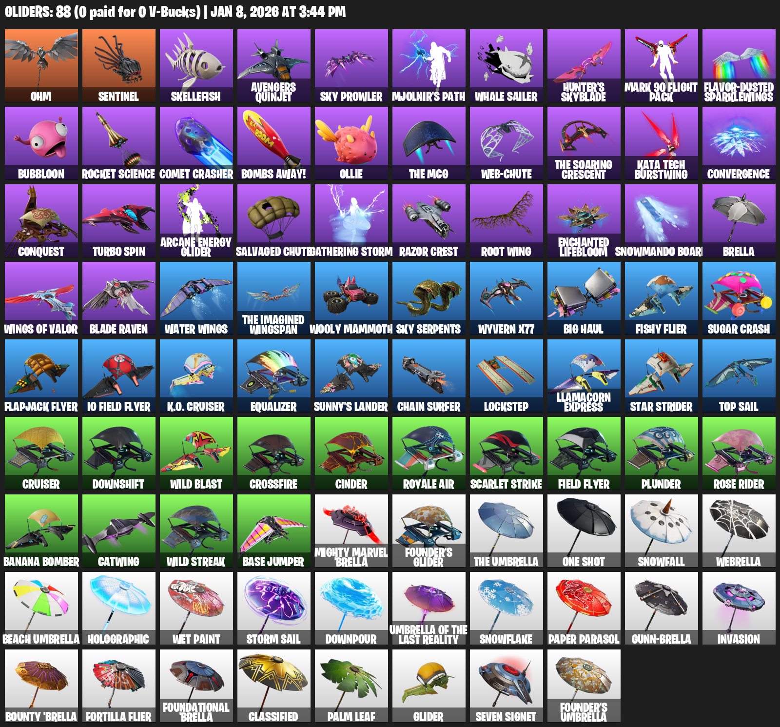 Ohm, Sentinel, Skellefish, Avengers Quinjet, Sky Prowler, Mjolnir’s Path, Whale Sailer, Hunter’s Skyblade, Mark 90 Flight Pack, Flavor-Dusted Sparklewings, Bubbloon, Rocket Science, Comet Crasher, Bombs Away!, Ollie, Web-Chute, Kata Tech Burstwing, Convergence