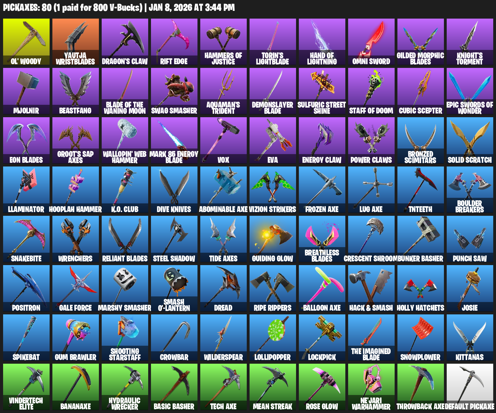 Ol’ Woody, Yautja Wristblades, Dragon’s Claw, Rift Edge, Hammers of Justice, Torin’s Lightblade, Omni Sword, Gilded Morphic Blades, Knight’s Torment, Mjolnir, Beastfang, Swag Smasher, Aquaman’s Trident, Demonslayer Blade, Sulfuric Street Shine, Cubic Scepter