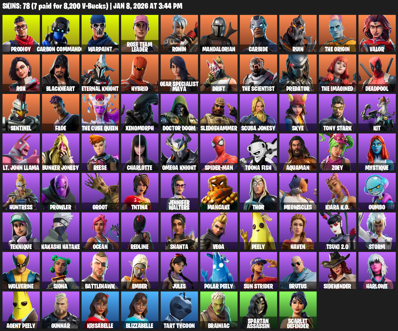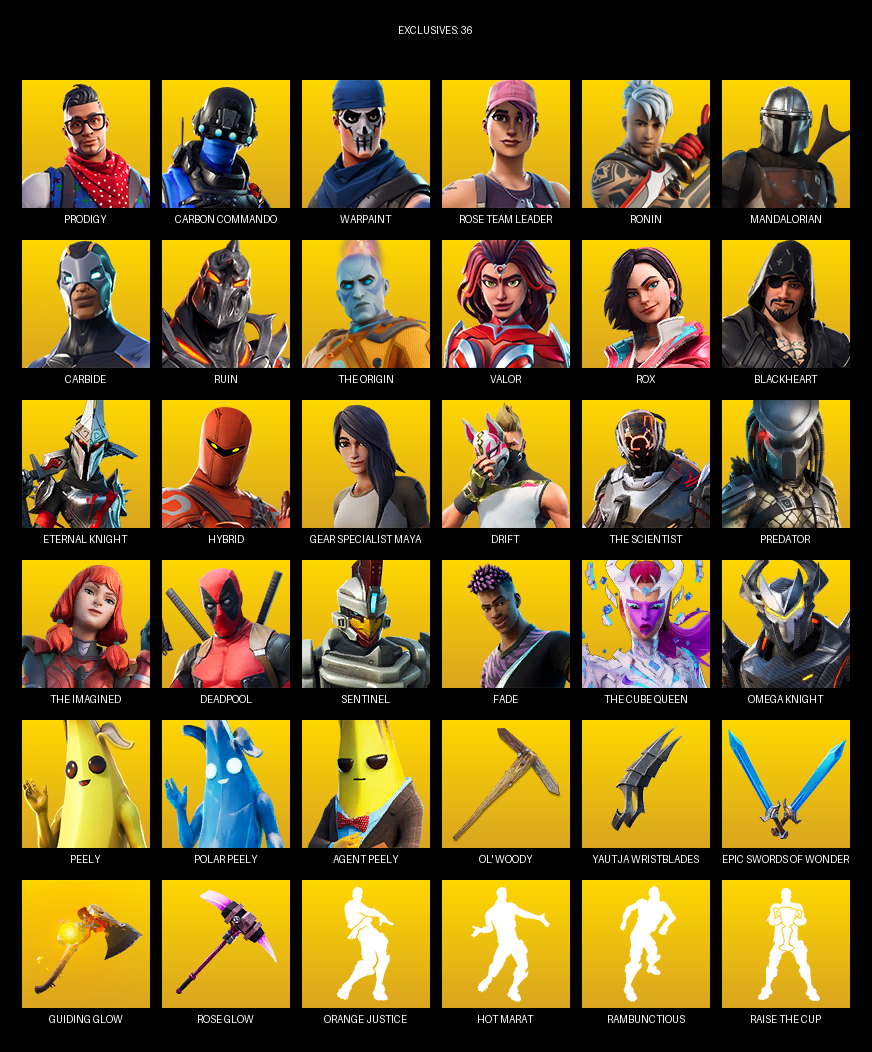 Gear Specialist Maya, Prodigy, Carbon Commando, Warpaint, Rose Team Leader, Ronin, Mandalorian, Carbide, Ruin, The Origin, Valor, Rox, Blackheart, Eternal Knight, Hybrid, Drift, Predator, Deadpool