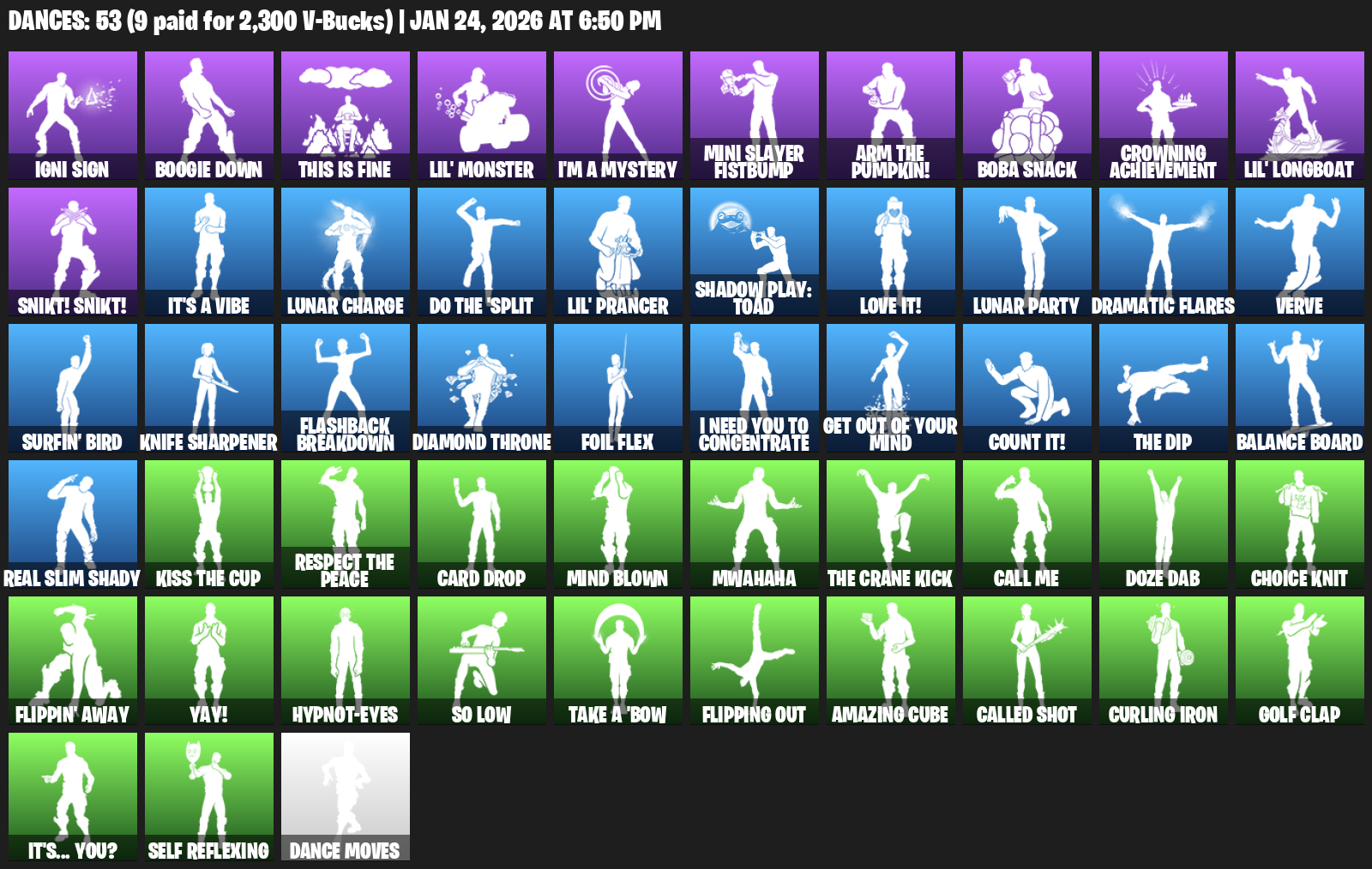 Igni Sign, Boogie Down, This is Fine, Lil’ Monster, I’m a Mystery, Mini Slayer Fistbump, Boba Snack, Crowning Achievement, Snikt! Snikt!, Lunar Charge, Shadow Play: Toad, Love it!, Dramatic Flares, Verve