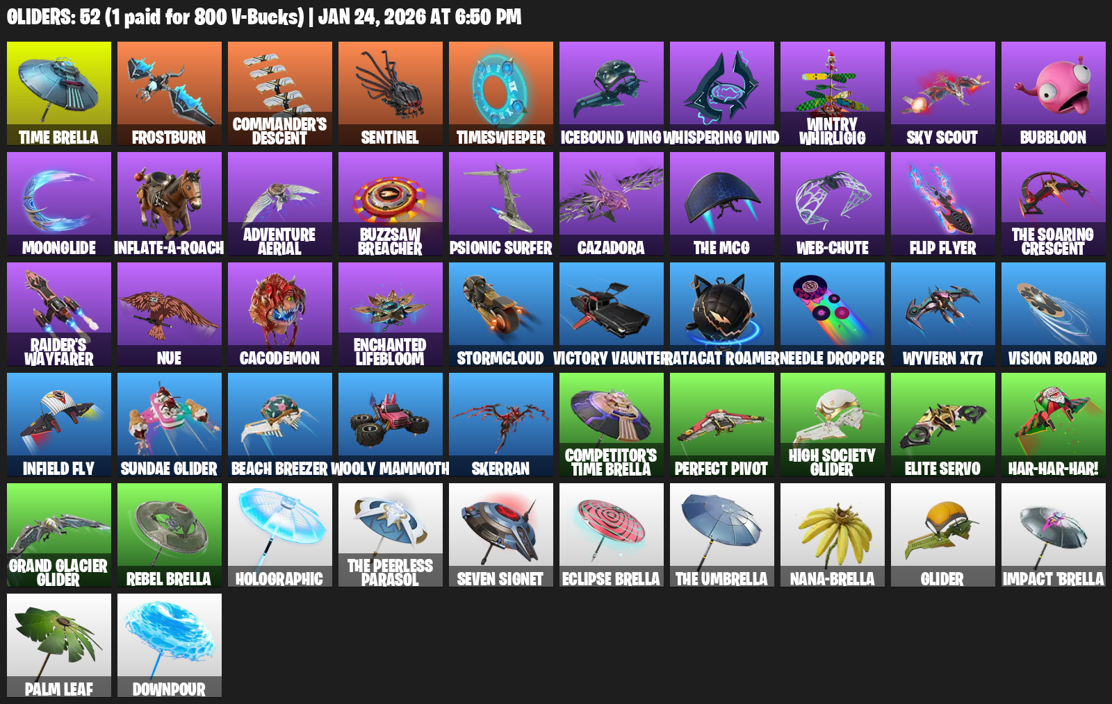 Time Brella, Frostburn, Commander’s Descent, Sentinel, Timesweeper, Whispering Wind, Wintry Whirligig, Sky Scout, Bubbloon, Moonglide, Adventure Aerial, Buzzsaw Breacher, Psionic Surfer, Cazadora, Flip Flyer