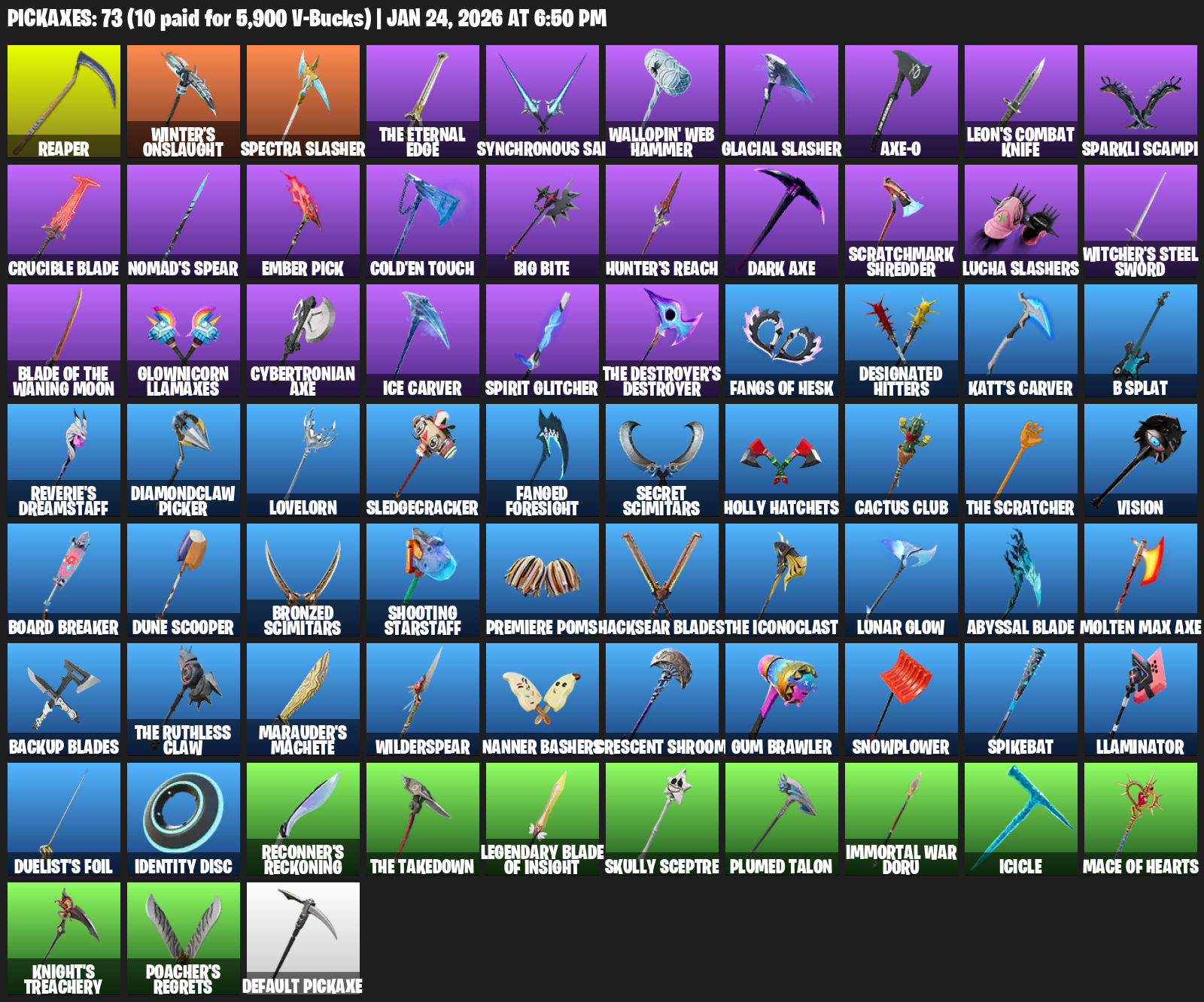 Reaper, Winter’s Onslaught, Synchronous Sai, Wallopin’ Web Hammer, Glacial Slasher, aXe-O, Leon’s Combat Knife, Sparkli Scampi, Crucible Blade, Nomad’s Spear, Ember Pick, Cold’en Touch, Big Bite, Hunter’s Reach, Scratchmark Shredder, Lucha Slashers, Witcher’s Steel Sword