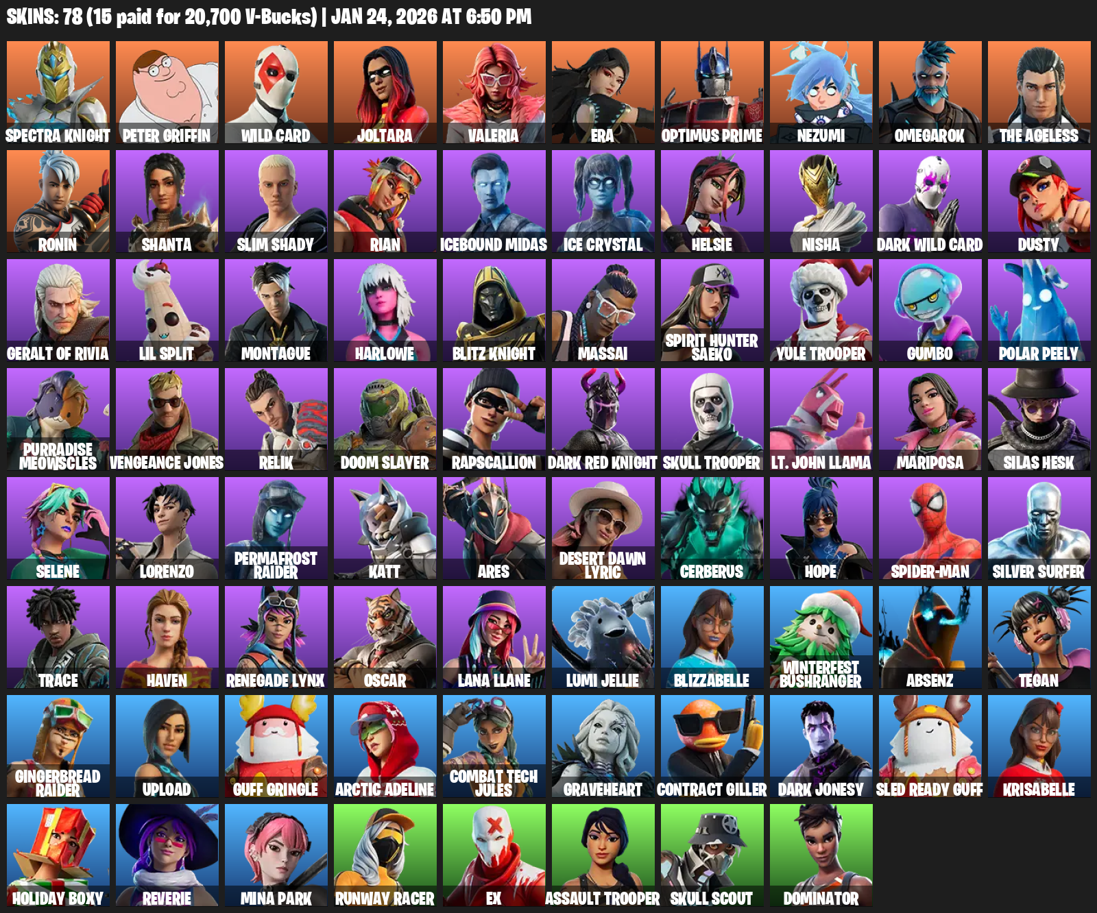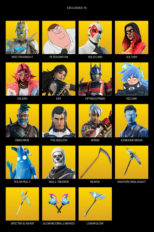 Spectra Knight, Peter Griffin, Wild Card, Joltara, Valeria, Era, Optimus Prime, Nezumi, Omegarok, The Ageless, Ronin, Shanta, Slim Shady, Rian, Icebound Midas, Ice Crystal, Helsie, Nisha, Dusty