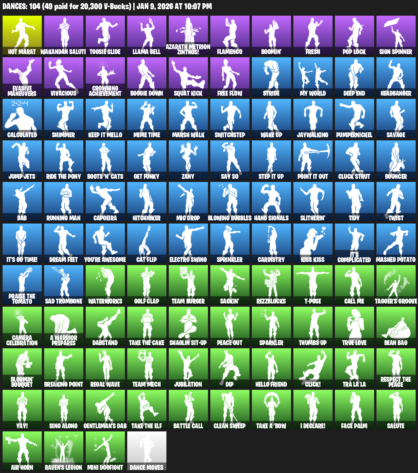 Hot Marat, Wakandan Salute, Toosie Slide, Llama Bell, Azarath Metrion Zinthos!, Flamenco, Boomin’, Fresh, Pop Lock, Sign Spinner, Evasive Maneuvers, Vivacious, Crowning Achievement, Boogie Down, Squat Kick, Free Flow, Stride, My World, Deep End, Headbanger