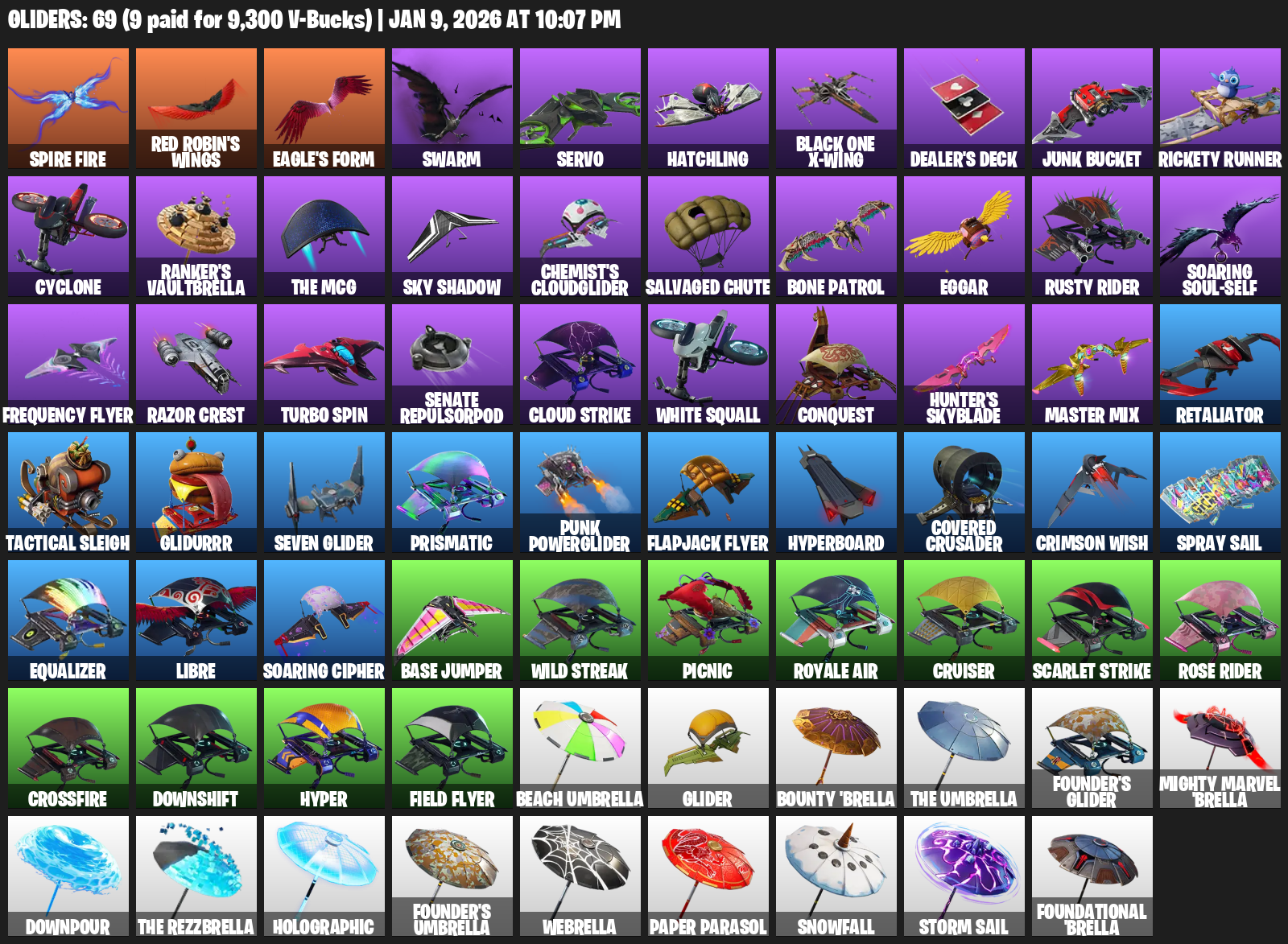 Red Robin’s Wings, Eagle’s Form, Swarm, Servo, Hatchling, Black One X-wing, Dealer’s Deck, Junk Bucket, Rickety Runner, Cyclone, Ranker’s Vaultbrella, The MCG, Chemist’s Cloudglider, Salvaged Chute, Bone Patrol, Eggar, Rusty Rider, Soaring Soul-Self