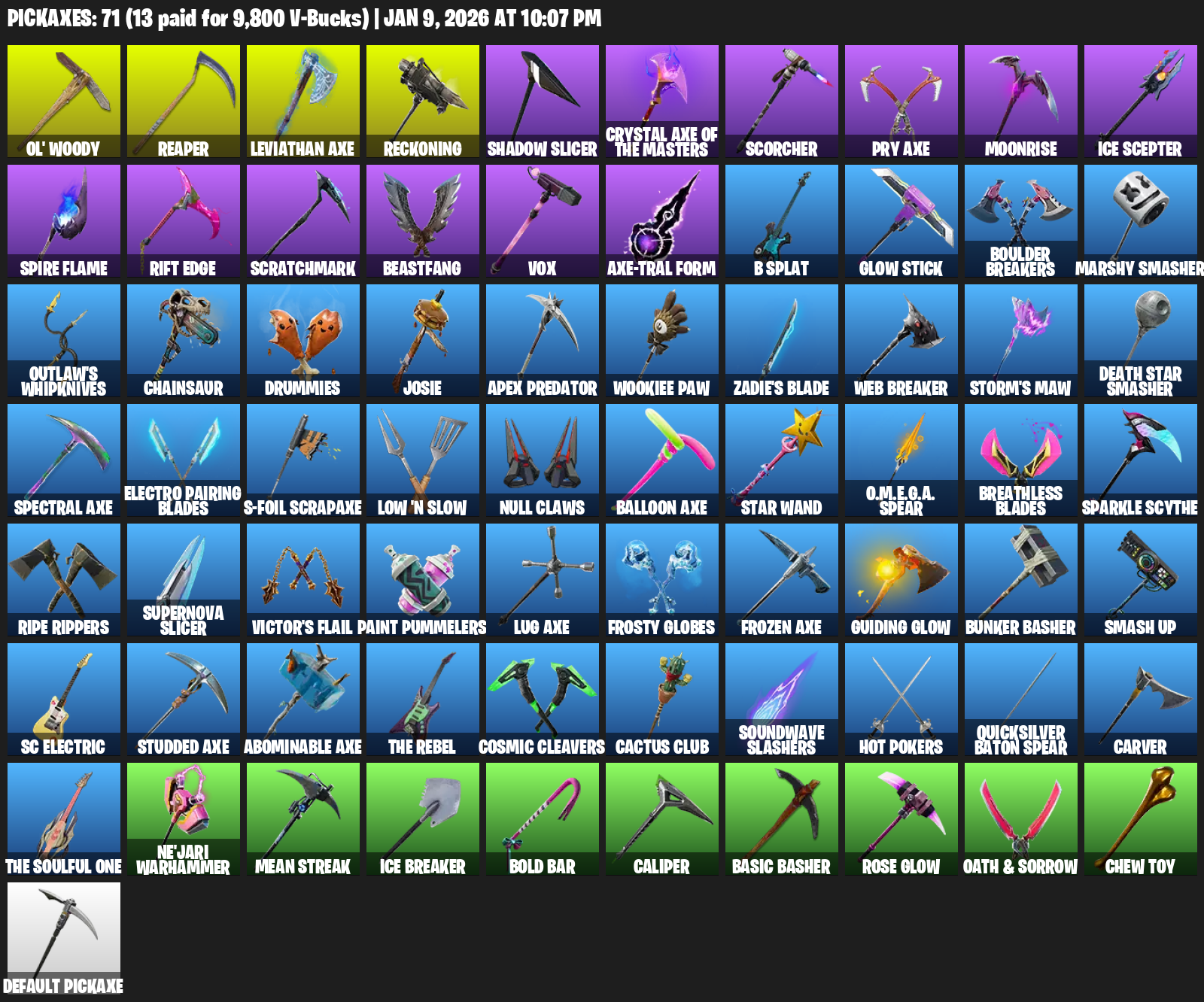 Leviathan Axe, Ol’ Woody, Reaper, Reckoning, Shadow Slicer, Scorcher, Moonrise, Ice Scepter, Rift Edge, Scratchmark, Beastfang, Vox, B Splat, Boulder Breakers, Marshy Smasher