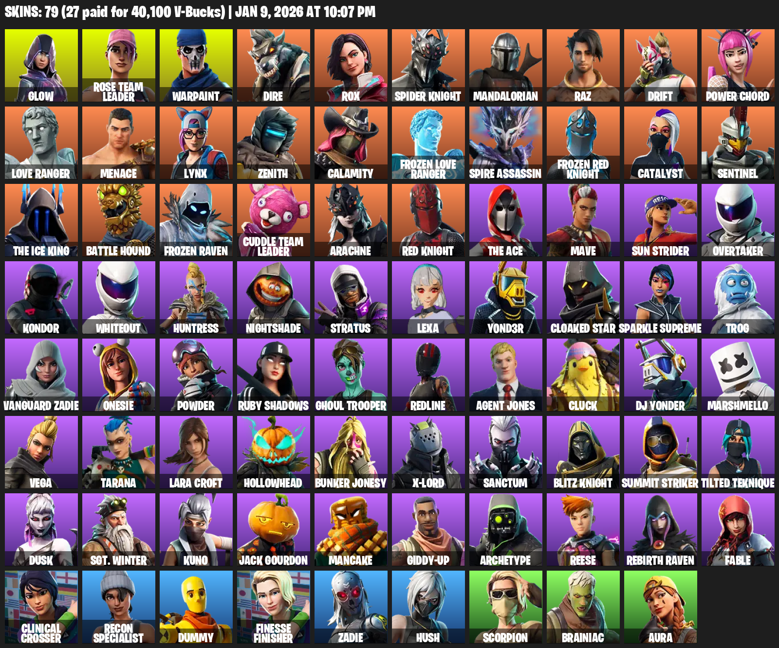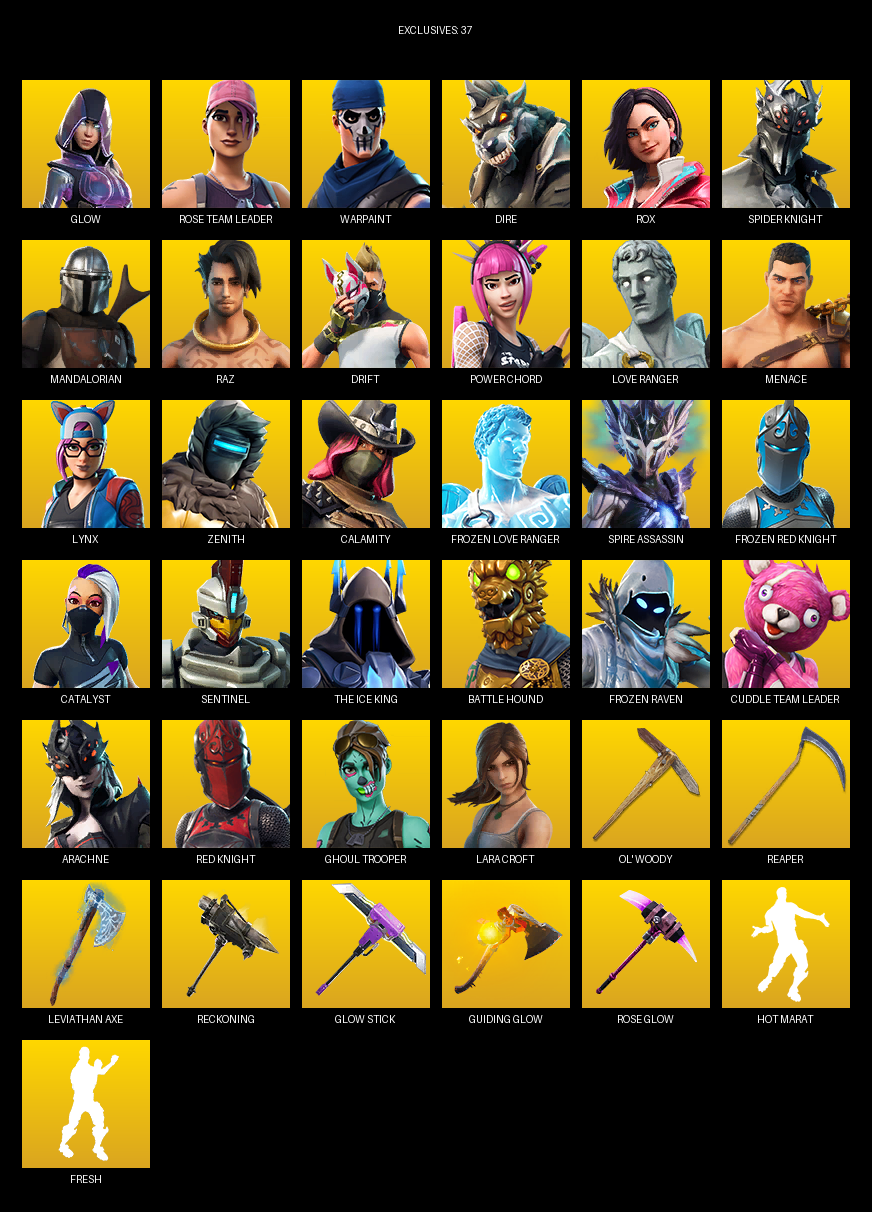 Lara Croft, Glow, Rose Team Leader, Warpaint, Dire, Rox, Spider Knight, Mandalorian, Raz, Drift, Power Chord, Love Ranger, Menace, Lynx, Zenith, Calamity, Spire Assassin, Catalyst