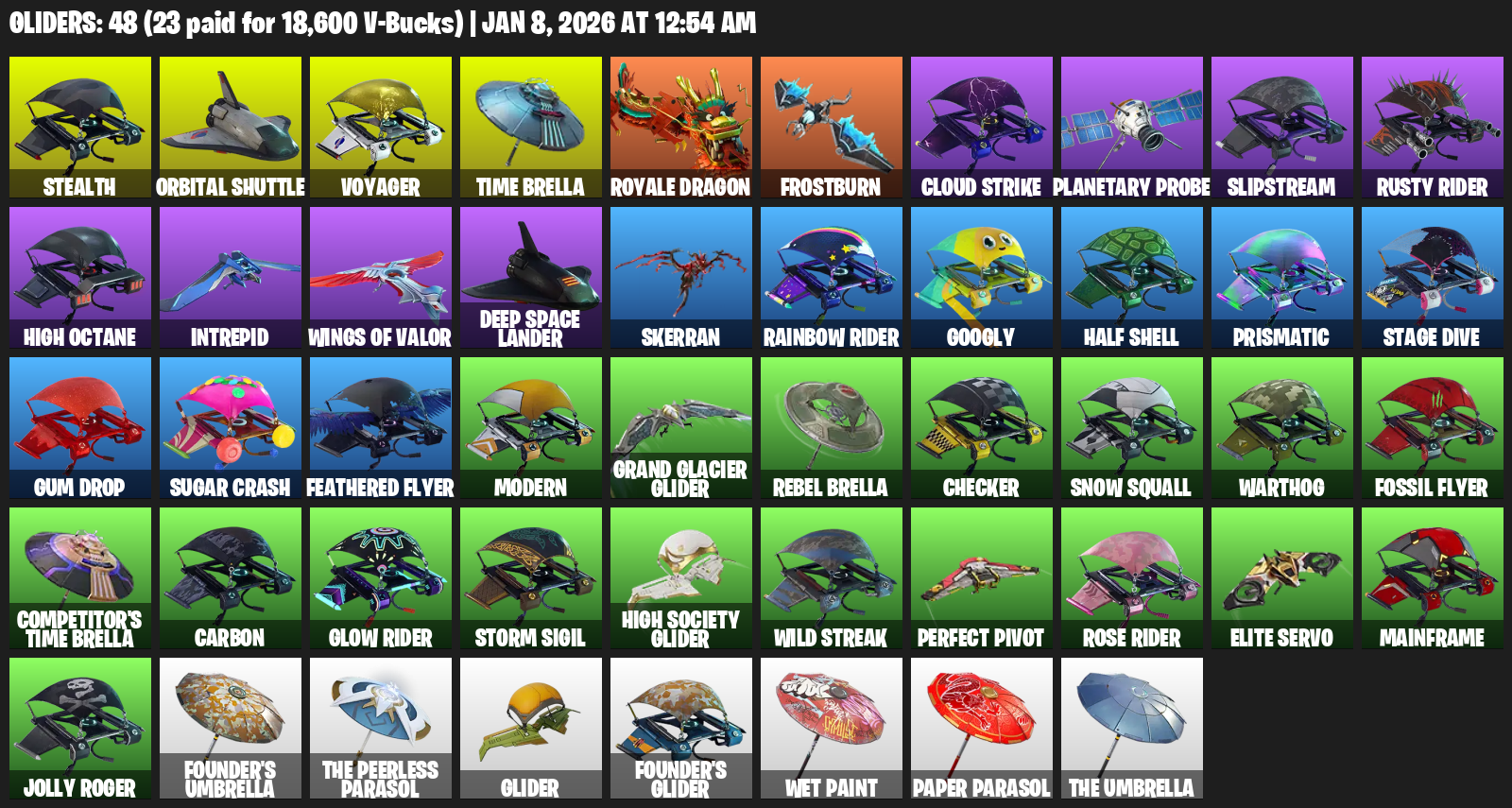 Stealth, Orbital Shuttle, Time Brella, Royale Dragon, Frostburn, Cloud Strike, Planetary Probe, Slipstream, Rusty Rider, High Octane, Intrepid, Deep Space Lander, Skerran, Googly, Half Shell, Prismatic, Stage Dive