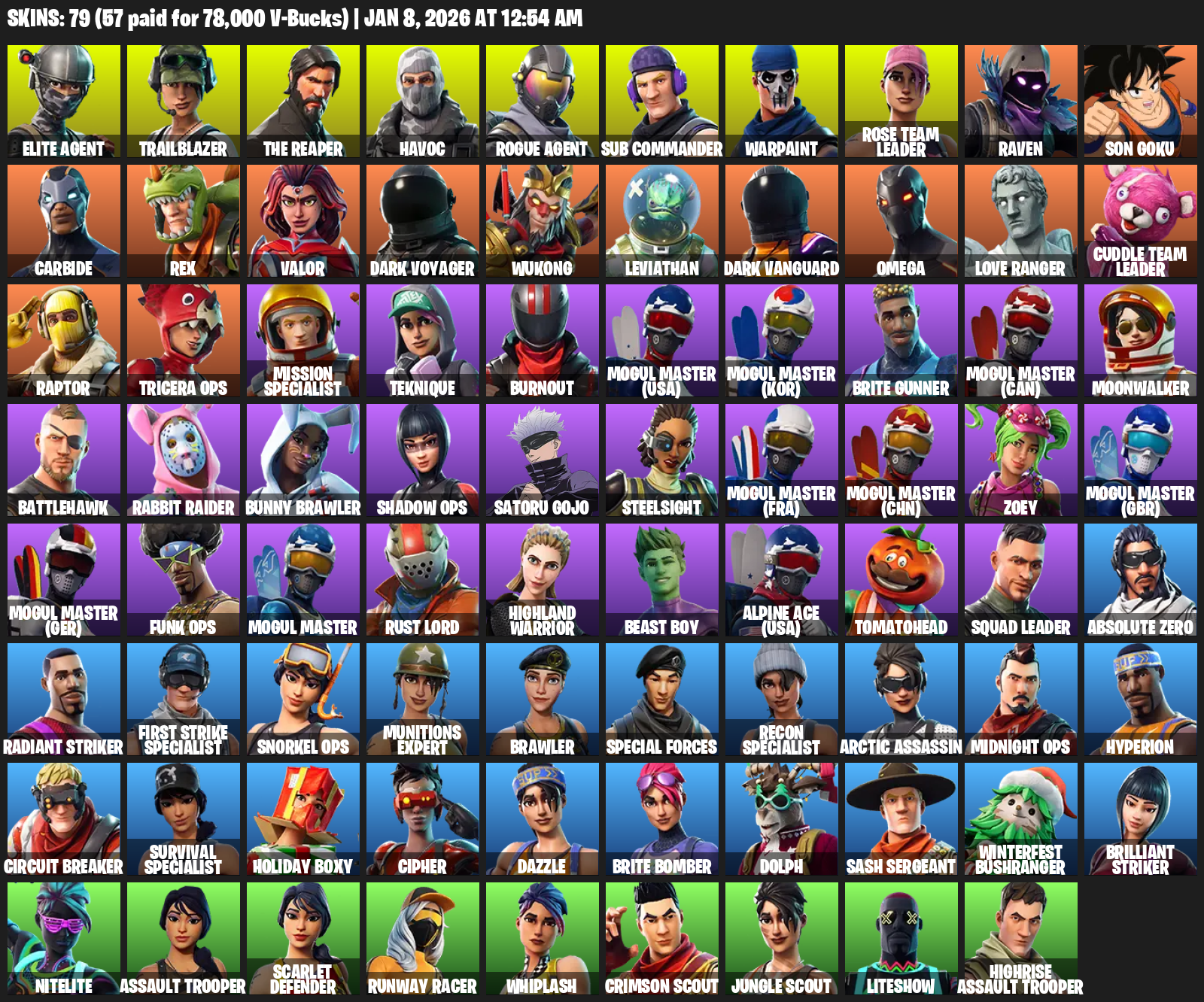 Elite Agent, The Reaper, Omega, Trailblazer, Havoc, Sub Commander, Warpaint, Rose Team Leader, Raven, Son Goku, Carbide, Rex, Valor, Dark Voyager, Wukong, Leviathan, Love Ranger