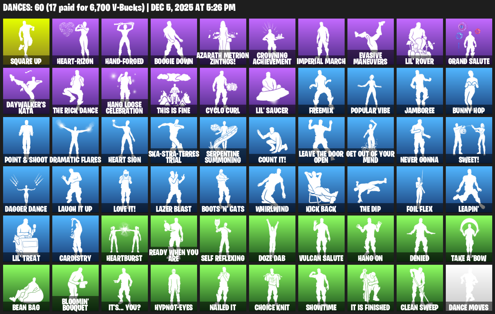 Square Up, Heart-rizon, Hand-Forged, Boogie Down, Azarath Metrion Zinthos!, Crowning Achievement, Imperial March, Evasive Maneuvers, Lil’ Rover, Grand Salute, Daywalker’s Kata, Hang Loose Celebration, This is Fine, Cyclo Curl, Freemix, Popular Vibe, Jamboree, Bunny Hop