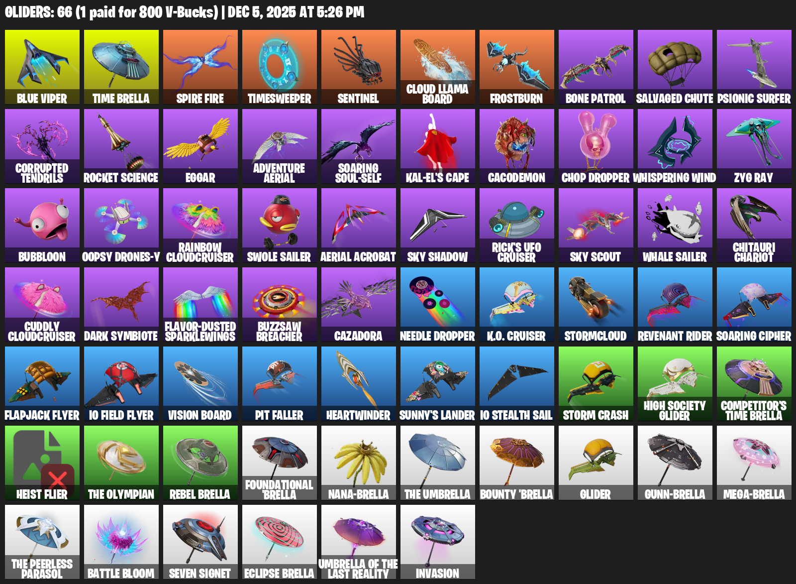 Blue Viper, Time Brella, Timesweeper, Sentinel, Cloud Llama Board, Frostburn, Bone Patrol, Salvaged Chute, Psionic Surfer, Rocket Science, Eggar, Adventure Aerial, Soaring Soul-Self, Kal-El’s Cape, Cacodemon, Chop Dropper, Whispering Wind, Zyg Ray