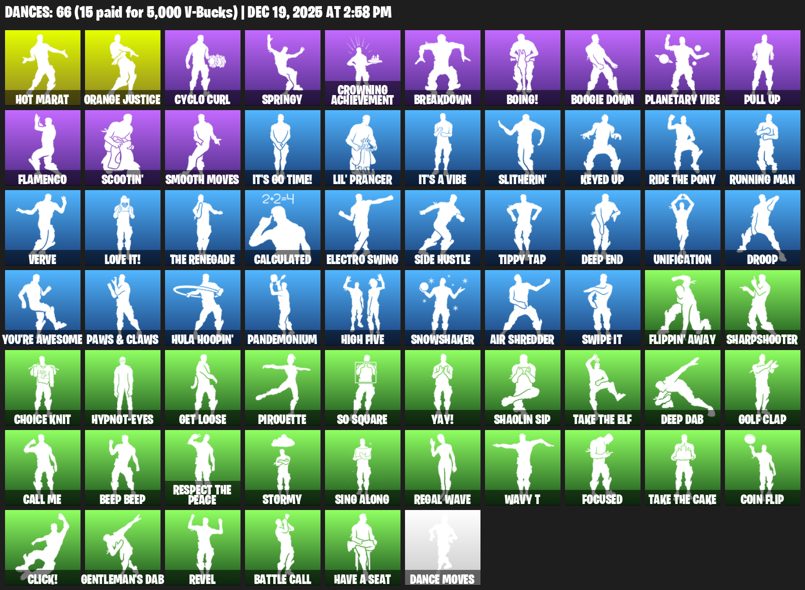 Hot Marat, Orange Justice, Cyclo Curl, Springy, Crowning Achievement, Breakdown, Boing!, Boogie Down, Planetary Vibe, Pull Up, Flamenco, Scootin’, Smooth Moves, It’s Go Time!, Lil’ Prancer, Slitherin’, Running Man
