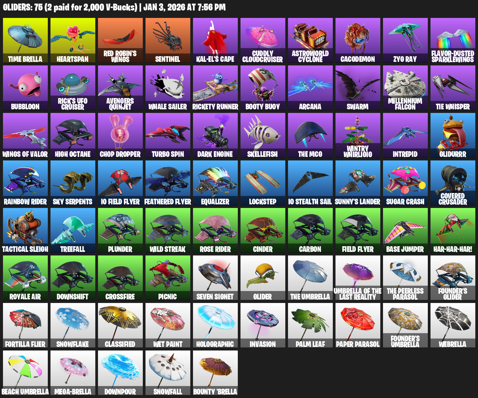Time Brella, Heartspan, Red Robin’s Wings, Sentinel, Kal-El’s Cape, Cuddly Cloudcruiser, Astroworld Cyclone, Cacodemon, Zyg Ray, Flavor-Dusted Sparklewings, Bubbloon, Rick’s UFO Cruiser, Avengers Quinjet, Whale Sailer, Rickety Runner, Booty Buoy, Arcana, Swarm, Millennium Falcon, TIE Whisper