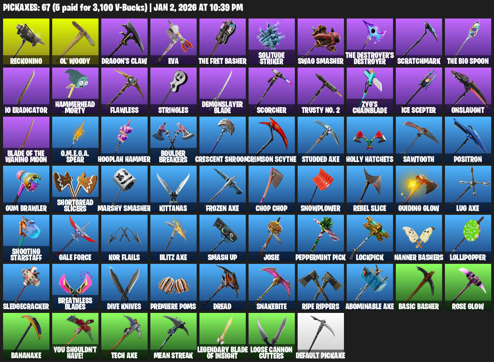 Reckoning, Ol’ Woody, Dragon’s Claw, EVA, Solitude Striker, Swag Smasher, Scratchmark, IO Eradicator, Hammerhead Morty, Flawless, Stringles, Demonslayer Blade, Scorcher, Trusty No. 2, Zyg’s Chainblade, Ice Scepter, Onslaught