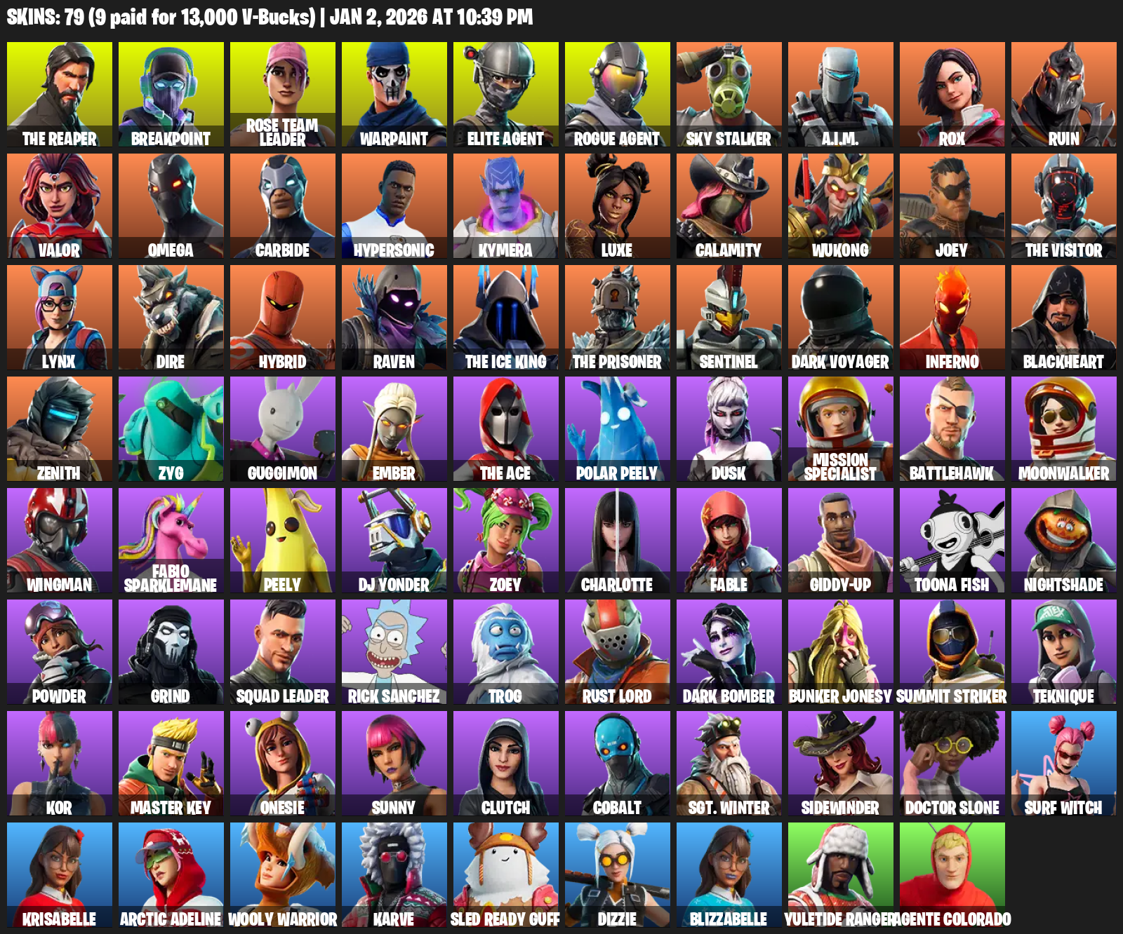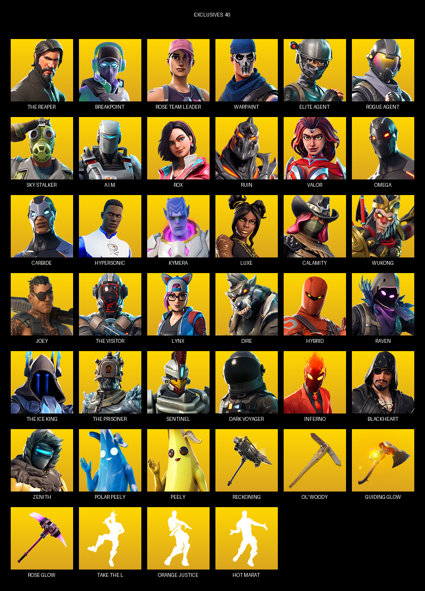 The Reaper, Elite Agent, Omega, Breakpoint, Rose Team Leader, Warpaint, Sky Stalker, A.I.M., Rox, Ruin, Valor, Carbide, Hypersonic, Kymera, Luxe, Calamity, Wukong, Joey