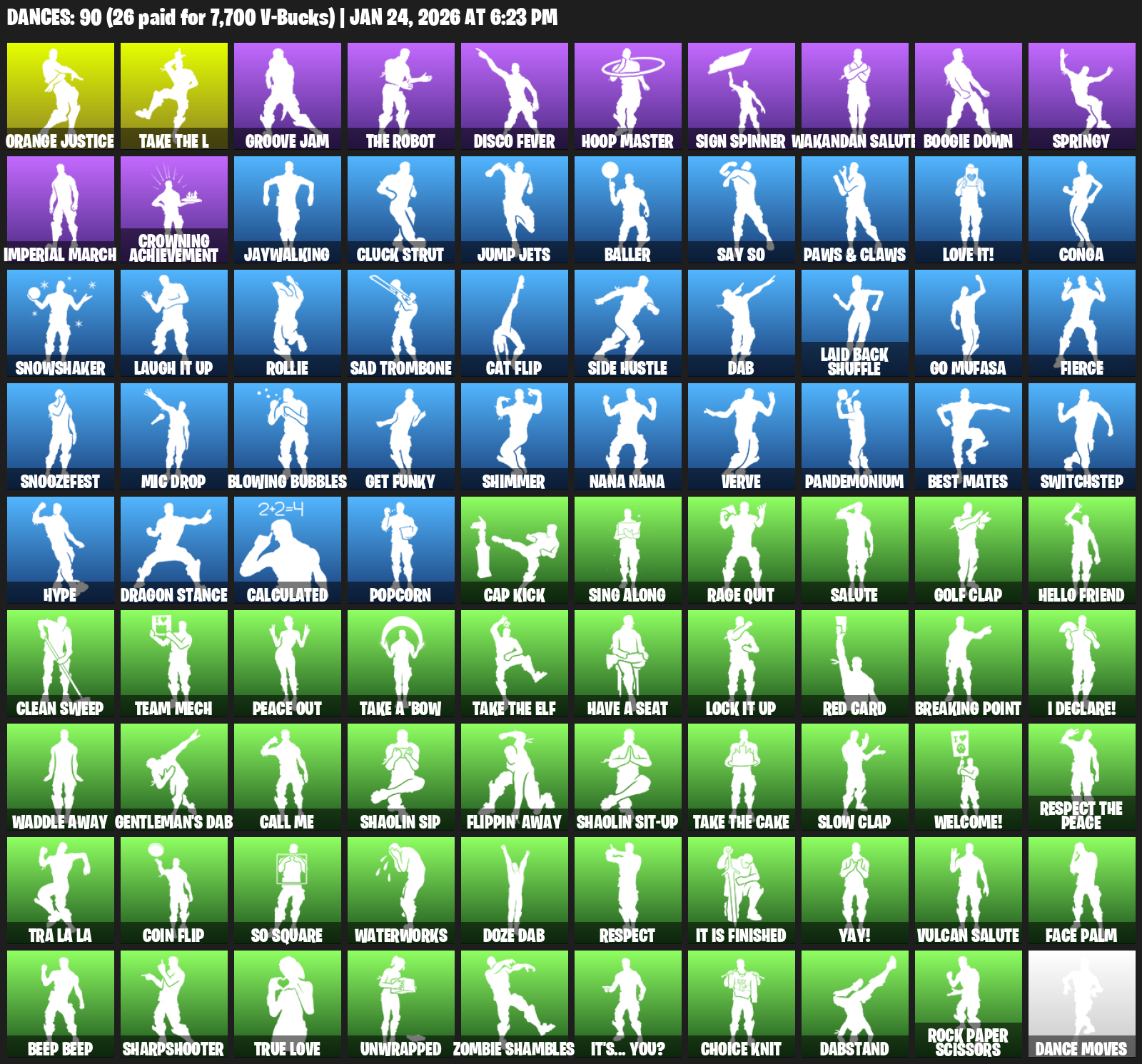Orange Justice, Groove Jam, Disco Fever, Hoop Master, Sign Spinner, Wakandan Salute, Boogie Down, Springy, Imperial March, Crowning Achievement, Jaywalking, Cluck Strut, Jump Jets, Baller, Say So, Paws & Claws, Love it!, Conga