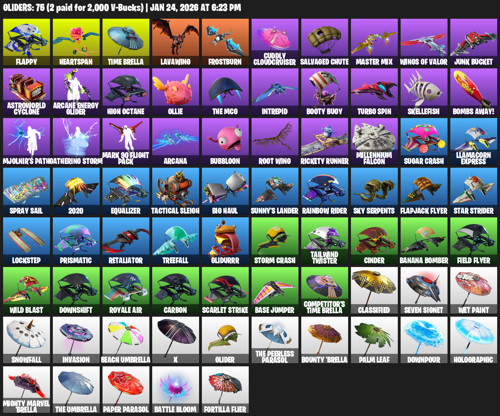 Flappy, Heartspan, Time Brella, Lavawing, Frostburn, Cuddly Cloudcruiser, Salvaged Chute, Junk Bucket, Astroworld Cyclone, High Octane, Ollie, Intrepid, Booty Buoy, Turbo Spin, Skellefish, Bombs Away!