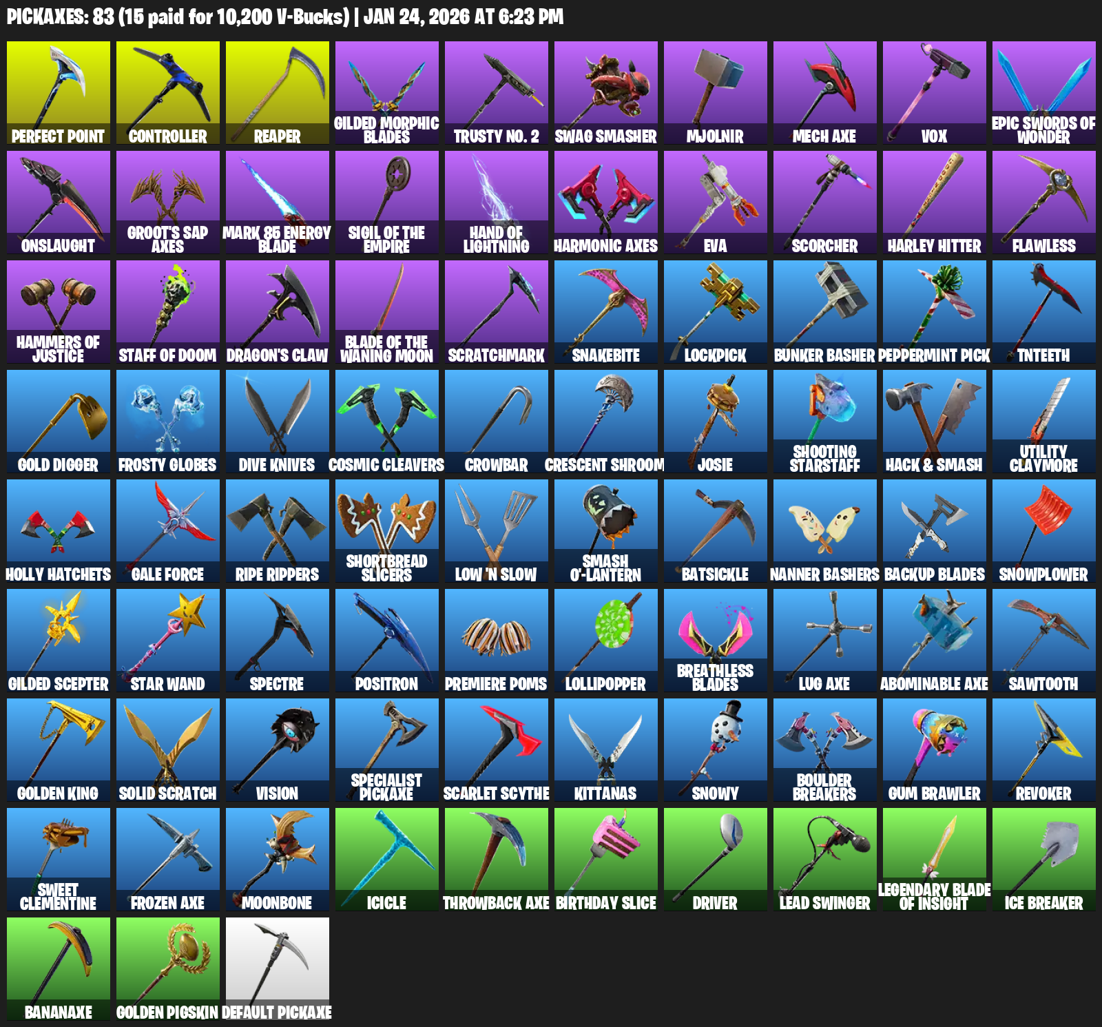 Perfect Point, Controller, Gilded Morphic Blades, Trusty No. 2, Swag Smasher, Mjolnir, Mech Axe, Vox, Onslaught, Groot’s Sap Axes, Mark 85 Energy Blade, Hand of Lightning, EVA, Scorcher, Harley Hitter, Flawless