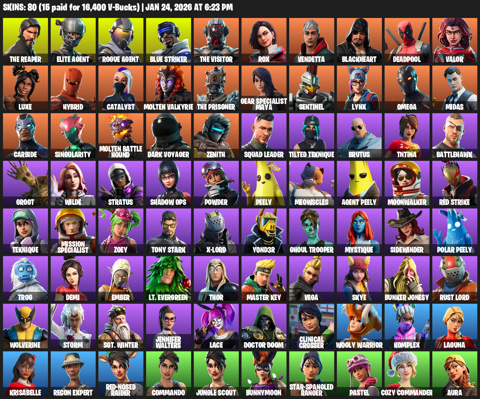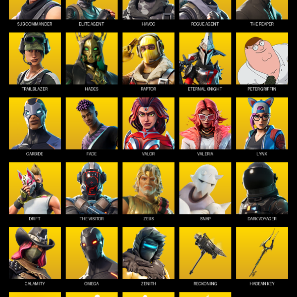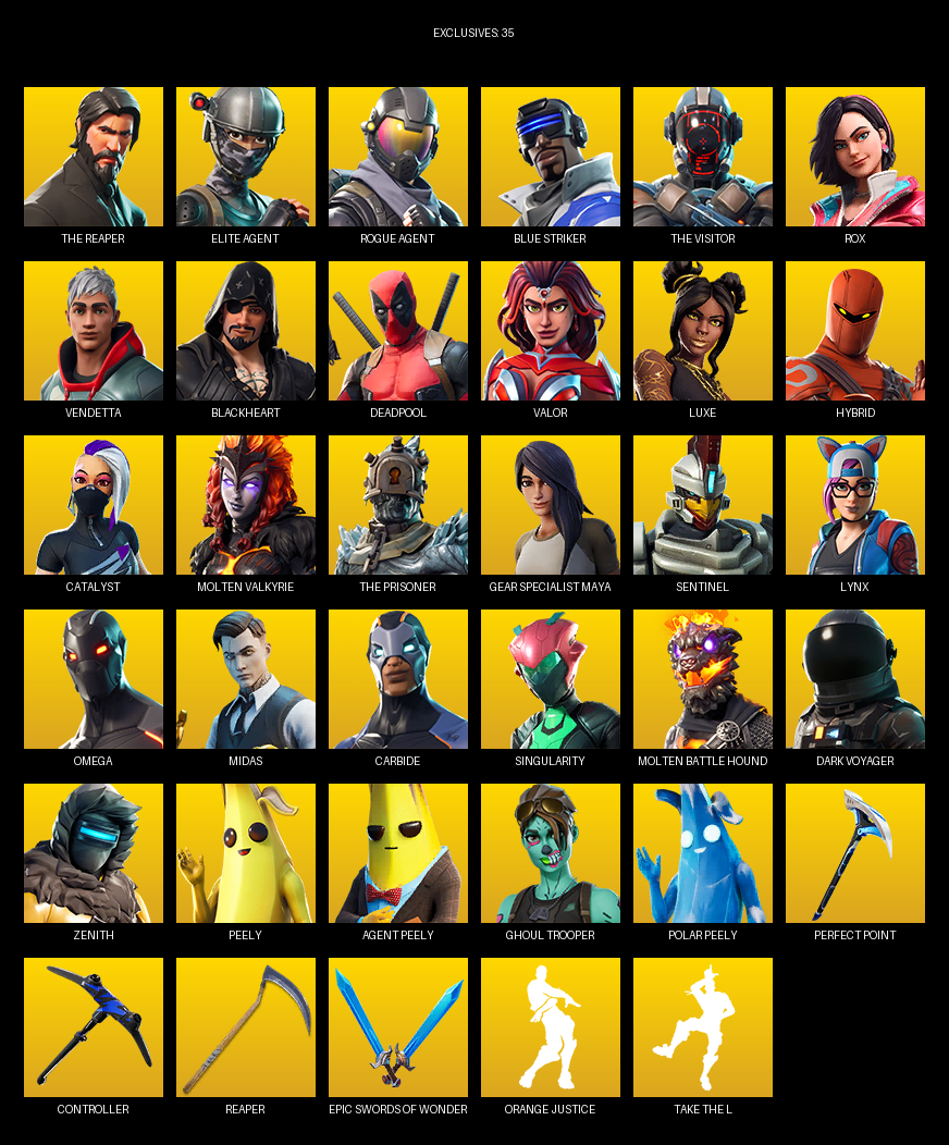 The Reaper, Elite Agent, Gear Specialist Maya, Omega, Blue Striker, Rox, Vendetta, Blackheart, Deadpool, Valor, Luxe, Hybrid, Catalyst, Molten Valkyrie, Sentinel, Lynx, Midas