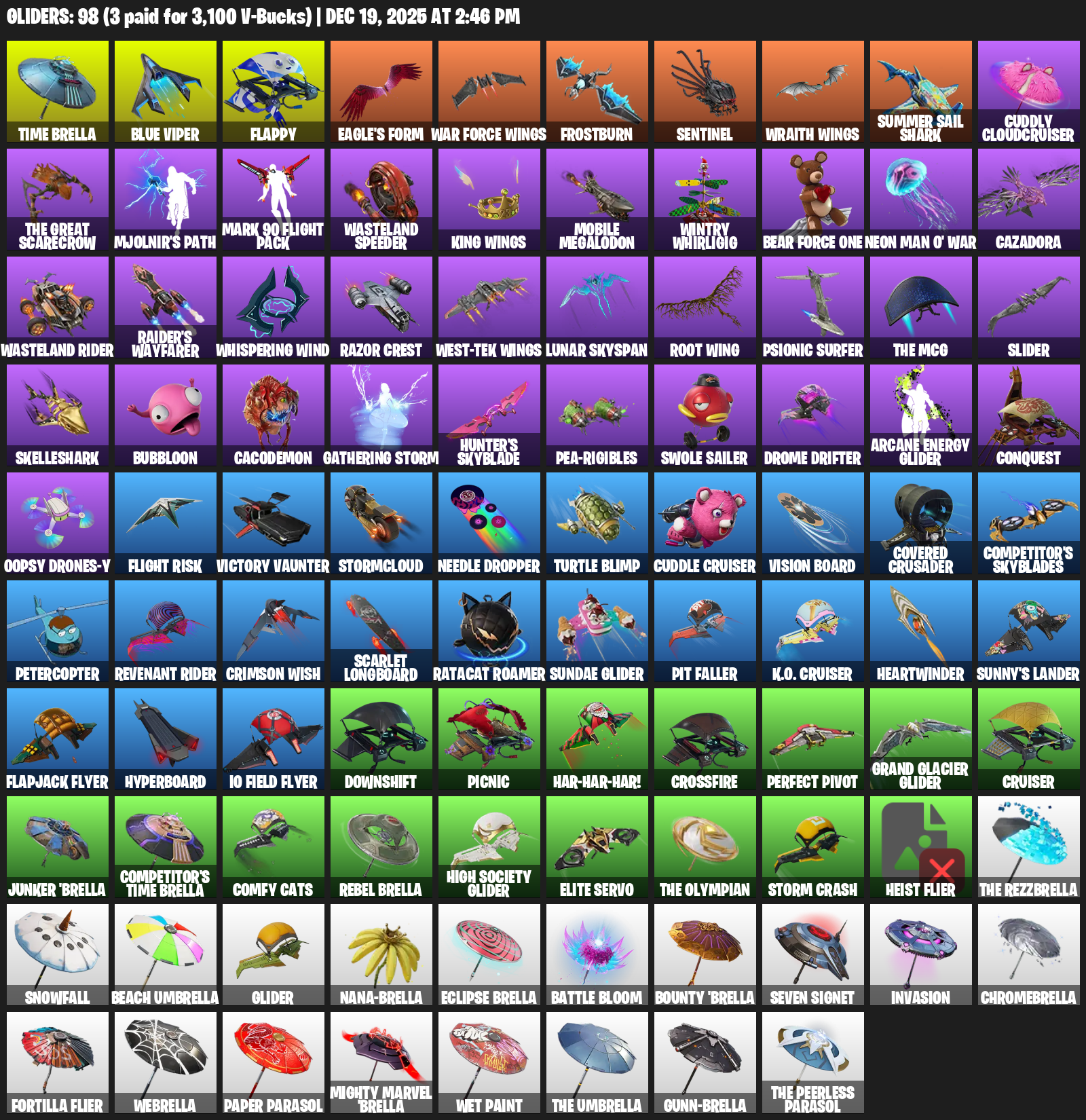 Time Brella, Blue Viper, Flappy, Eagle’s Form, War Force Wings, Frostburn, Sentinel, Summer Sail Shark, Cuddly Cloudcruiser, Mjolnir’s Path, Mark 90 Flight Pack, Wasteland Speeder, Mobile Megalodon, Wintry Whirligig, Cazadora