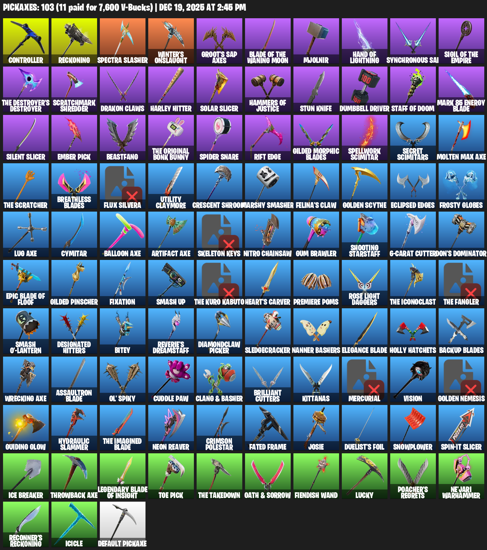 Controller, Reckoning, Winter’s Onslaught, Groot’s Sap Axes, Blade of the Waning Moon, Mjolnir, Synchronous Sai, Scratchmark Shredder, Drakon Claws, Harley Hitter, Solar Slicer, Stun Knife, Dumbbell Driver