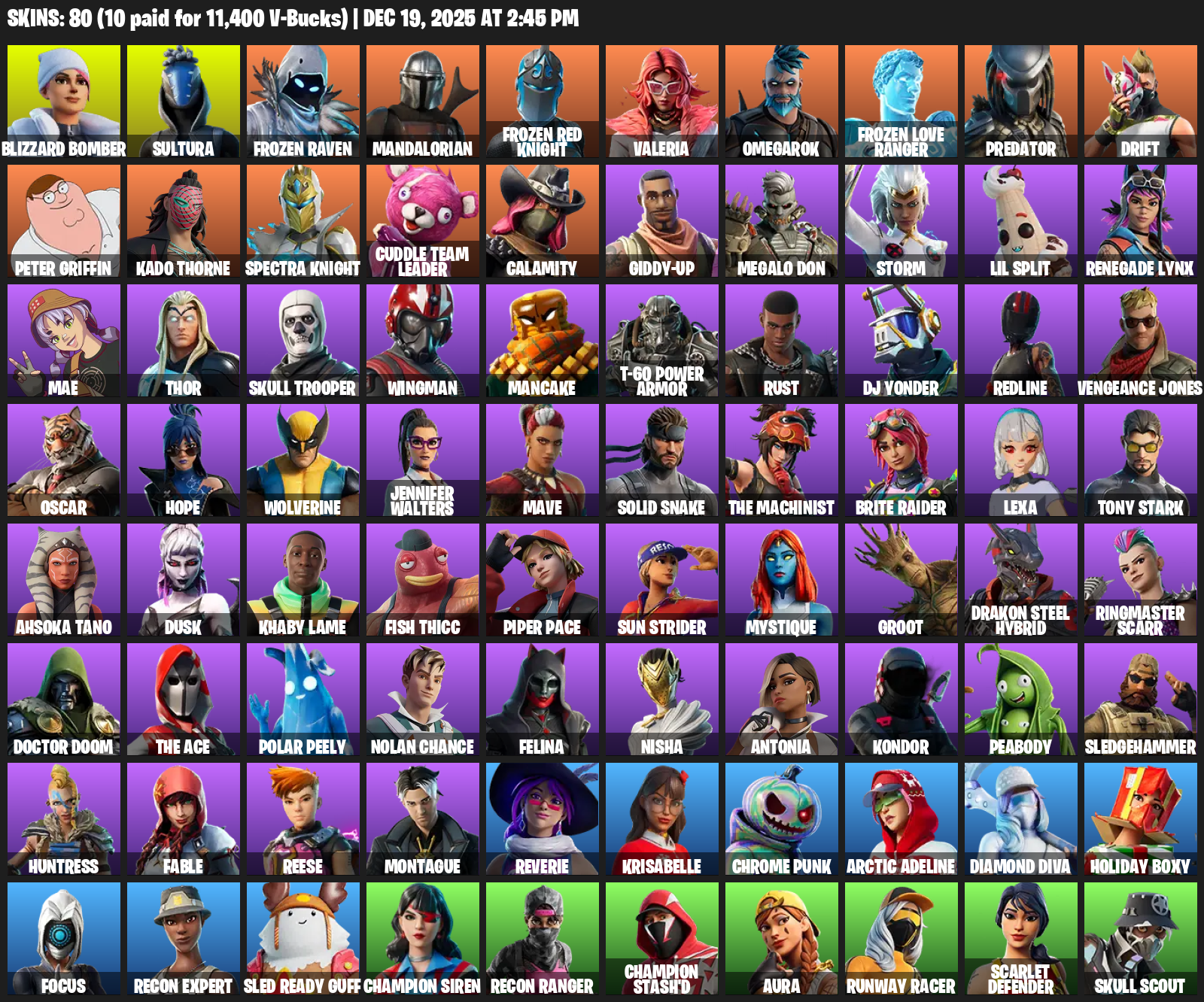Blizzard Bomber, Sultura, Frozen Raven, Mandalorian, Valeria, Omegarok, Predator, Drift, Peter Griffin, Kado Thorne, Spectra Knight, Cuddle Team Leader, Calamity, Giddy-up, Megalo Don, Storm, Lil Split, Renegade Lynx